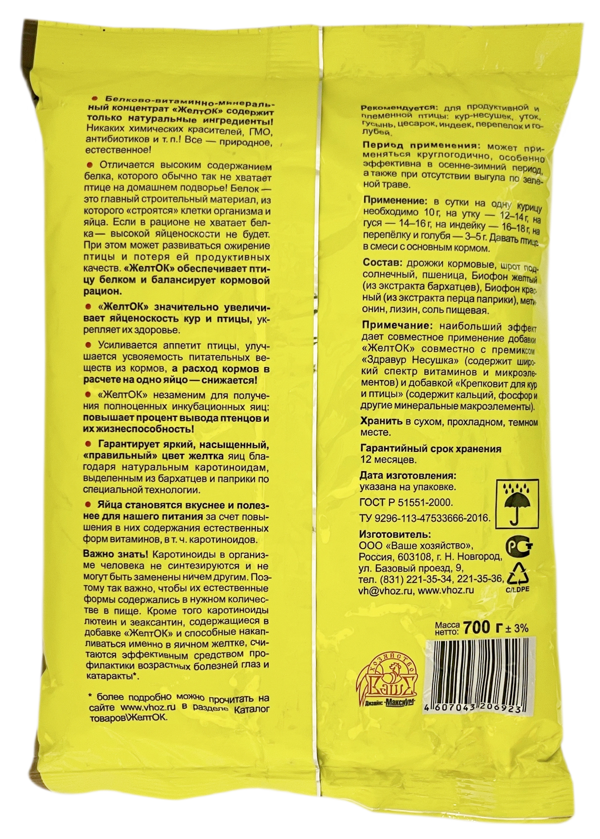 Желток 700г кормовая добавкаЖелток «Ваше хозяйство» обеспечивает птицу белком и балансирует кормовой рацион, чтобы была высокая яйценосность и не развивалось ожирение.