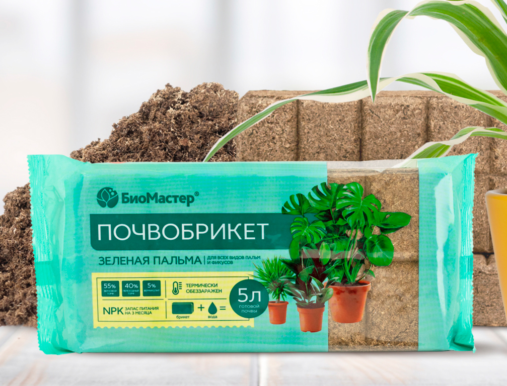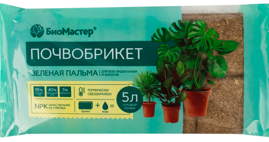 Почвобрикет «БиоМастер» «Зеленая Пальма» — плодородная спрессованная почва, включающая верховой (50%) и переходный (45%) торф добавлением вермикулита, содержит 3-месячный запас питательных элементов. Предназначен для всех видов пальм и фикусов, а также других декоративно-лиственных культур. Оптимальный баланс всех компонентов обеспечивает гармоничное развитие растений и высокую декоративность. Брикет дает 5 л готового грунта.Состав: верховой торф -50%, переходный торф -45%, вермикулит- 5%, удобрение.