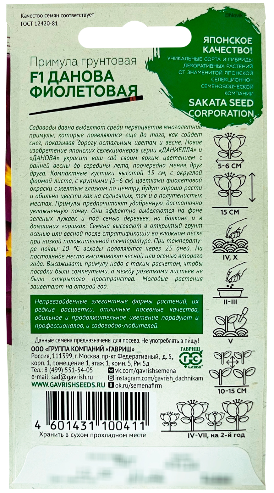 Примула Данова фиолетовая F1 СакатаСадоводы давно выделяют среди первоцветов многолетние примулы, которые появляется еще до того, как сойдет снег, показывая дорогу остальным цветам и весне. Новое изобретение японских селекционеров серии «ДАНИЕЛЛА» и «ДАНОВА» украсят ваш сад своим ярким цветением с ранней весны до середины лета, поочередно меняя друг друга. Компактные кустики высотой 15 см с округлой формой листа, с крупными цветками (5-6 см) фиолетовой окраски с желтым глазком по центру будут хорошо расти и обильно цвести как на солнечных, так и полутенистых местах. Примулы предпочитают удобренную, достаточно увлажненную почву. Они эффектно выделяется на фоне зеленых лужаек и под сенью деревьев, на балконе и в домашних горшках. Семена высевают в открытый грунт осенью или весной после стратификации во влажном песке при низкой положительной температуре, в течение 3-4 недель. При температуре почвы +10°С всходы появляются через 25 дней. На постоянное место высаживают весной или осенью второго года. Высаживать примулу надо с таким расчетом, чтобы посадки были сомкнутыми, а между розетками листьев не было открытого пространства. Молодые растения зацветают на второй год.