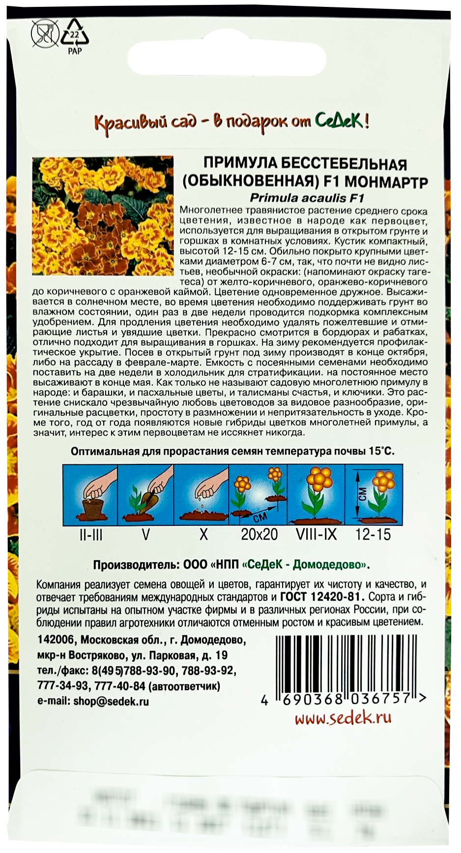 ПРИМУЛА МОНМАРТР F1 (БЕССТЕБЕЛЬНАЯ)Многолетнее травянистое растение среднего срока цветения, известное в народе как первоцвет, используется для выращивания в открытом грунте и в горшках в комнатных условиях. Кустик компактный, высотой 12-15 см. Обильно покрыто крупными цветками диаметром 6-7 см, так, что почти не видно листьев, необычной окраски: (напоминают окраску тагетеса) от желто-коричневого, оранжево-коричневого до коричневого с оранжевой каймой. Цветение одновременное дружное. Высаживается в солнечном месте, во время цветения необходимо поддерживать грунт во влажном состоянии, один раз в две недели проводится подкормка комплексным удобрением. Для продления цветения необходимо удалять пожелтевшие и отмирающие листья и увядшие цветки. Прекрасно смотрится в бордюрах и рабатках, отлично подходит для выращивания в горшках. На зиму рекомендуется профилактическое укрытие. Посев в открытый грунт под зиму производят в конце Октября, либо на рассаду в Феврале-Марте. Емкость с посеянными семенами необходимо поставить на две недели в холодильник для стратификации. На постоянное место высаживают в конце мая. Как только не называют садовую многолетнюю примулу в народе: и барашки, и пасхальные цветы, и талисманы счастья, и ключики. Это растение снискало чрезвычайную любовь цветоводов за видовое разнообразие, оригинальные расцветки, простоту в размножении и непритязательность в уходе. Кроме того, год от года появляются новые гибриды цветков многолетней примулы, а значит, интерес к этим первоцветам не иссякнет никогда.