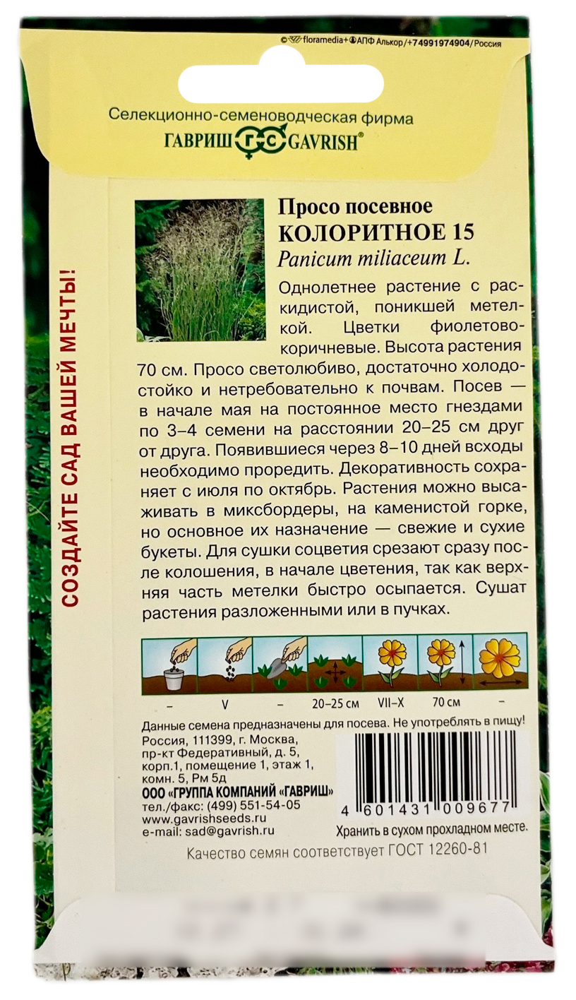 Просо посевное КОЛОРИТНОЕ 15 ГАВРИШОднолетнее растение, с раскидистой, поникшей метелкой. Цветки фиолетово-коричневые. Высота растения 70 см. Просо светолюбиво, достаточно холодостойко и нетребовательно к почвам. Посев в начале мая на постоянное место гнездами по 3 - 4 семени на расстоянии 20 -25 см друг от друга. Появившиеся через 8-10 дней всходы необходимо проредить. Декоративность сохраняет с июля по октябрь. Растения можно высаживать в миксбордере, на каменистой горке, но основное их назначение - свежие и сухие букеты. Для сушки соцветия срезают сразу после колошения, в начале цветения, так как верхняя часть метелки быстро осыпается. Сушат растения разложенными или в пучках.