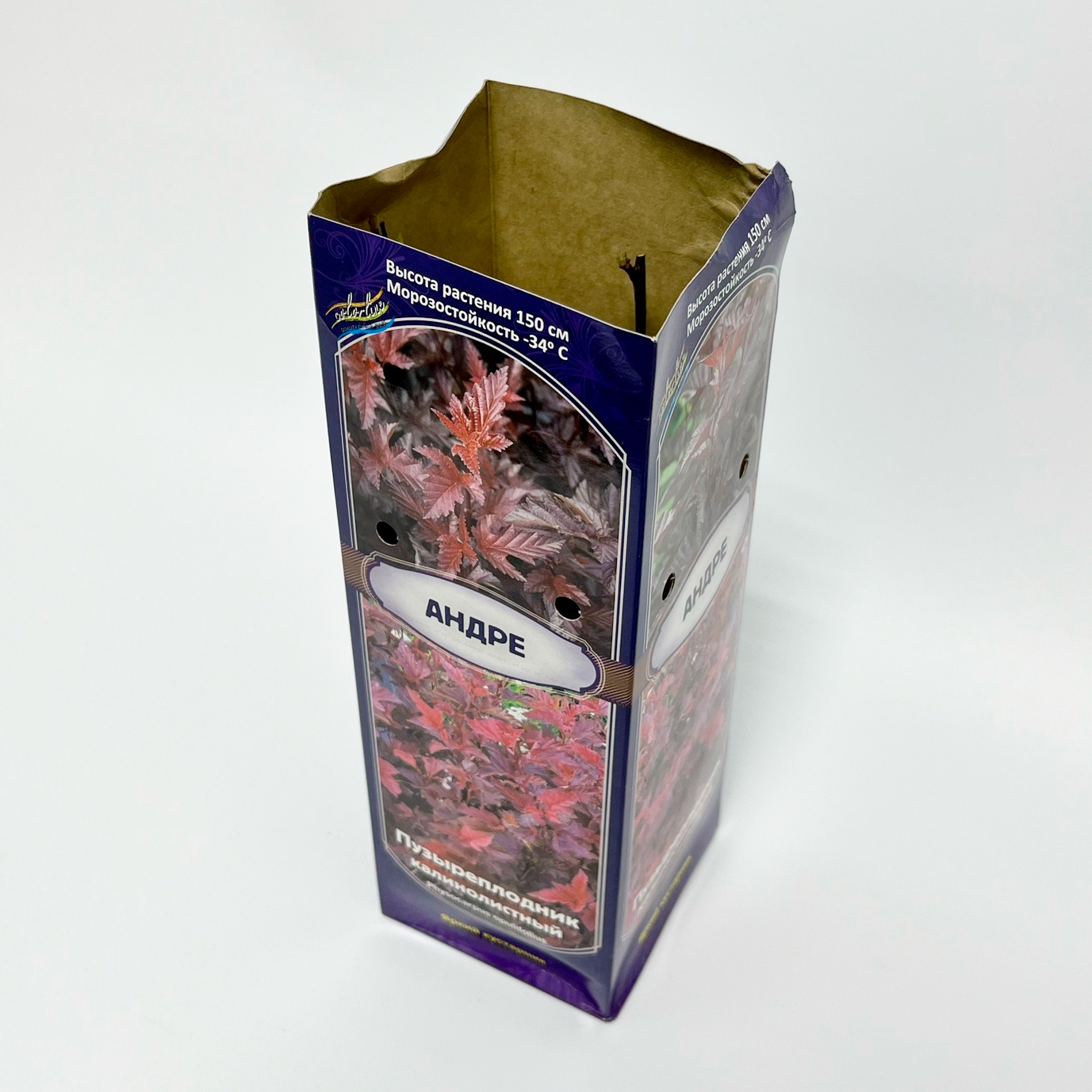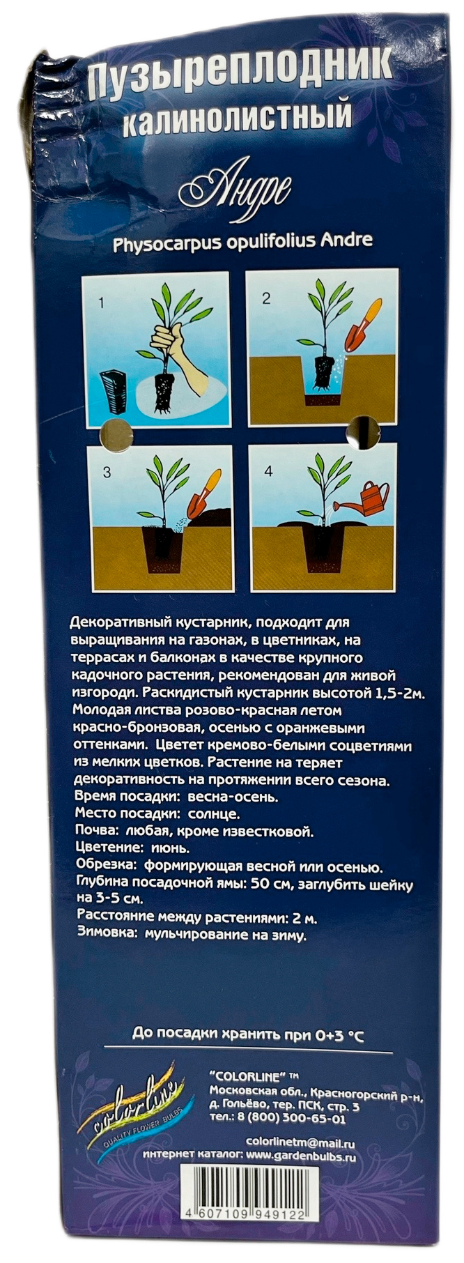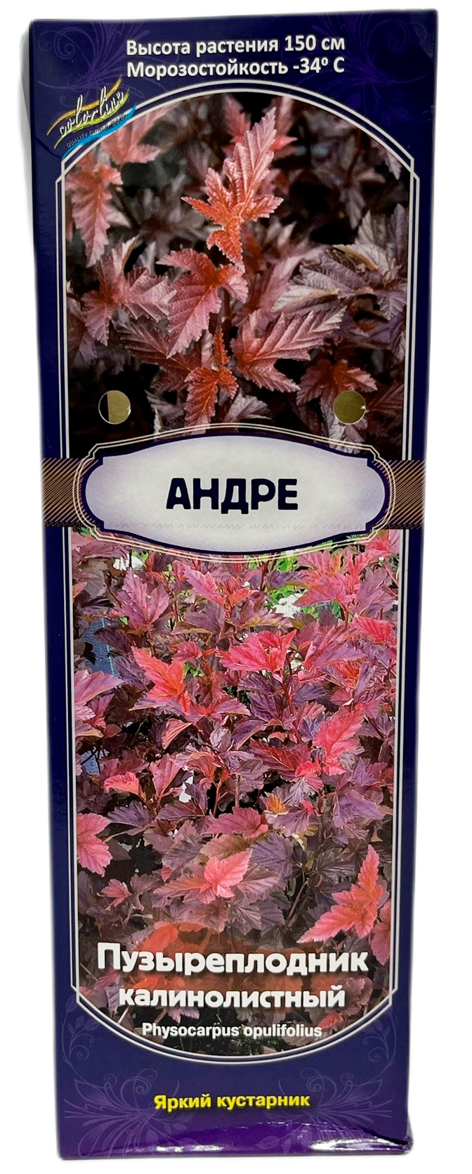 Пузыреплодник калинолистный АндреВысота растения 150 см. Морозостойкость - 34С. Яркий декоративный кустарник, подходит для выращивания на газонах, террасах и балконах в качестве крупного кадочного растения, рекомендован для живой изгороди. Молодая листва розово-красная летом красно-бронзовая, осенью с оранжевыми оттенками. Цветет кремово-белыми соцветиями из мелких цветов.