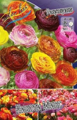 Ранункулюс Пикоти Микс относится к группе многолетних луковичных цветов. Цветки напоминают маленькие розы, а при роспуске изящные маки, или пионы. Высота растения 50 см. Смесь сортов серии Пикоти. Обладает легким слабо уловимым ароматом. Листья тройчаторассеченые, зеленые. Цветение май-июль 2-3 недели, в срезке отлично выглядят до 10-15 дней. Посадка корешков: глубина 6-8 см, на расстоянии 10-15 см. Клубеньки высаживают коготками вниз, место соединения коготков должно быть направлено вверх, иначе лютик погибает. Почва желательна рыхлая, плодородная. Место посадки интенсивно освещенное и в полутени. Ранункулюс устойчив, как к высоким, так и к низким температурам. Размножают ранункулюсы дочерними корневищами, клубнями-детками. Сфера использования при высадке на клумбах, рабатках, в бордюре.Характеристики