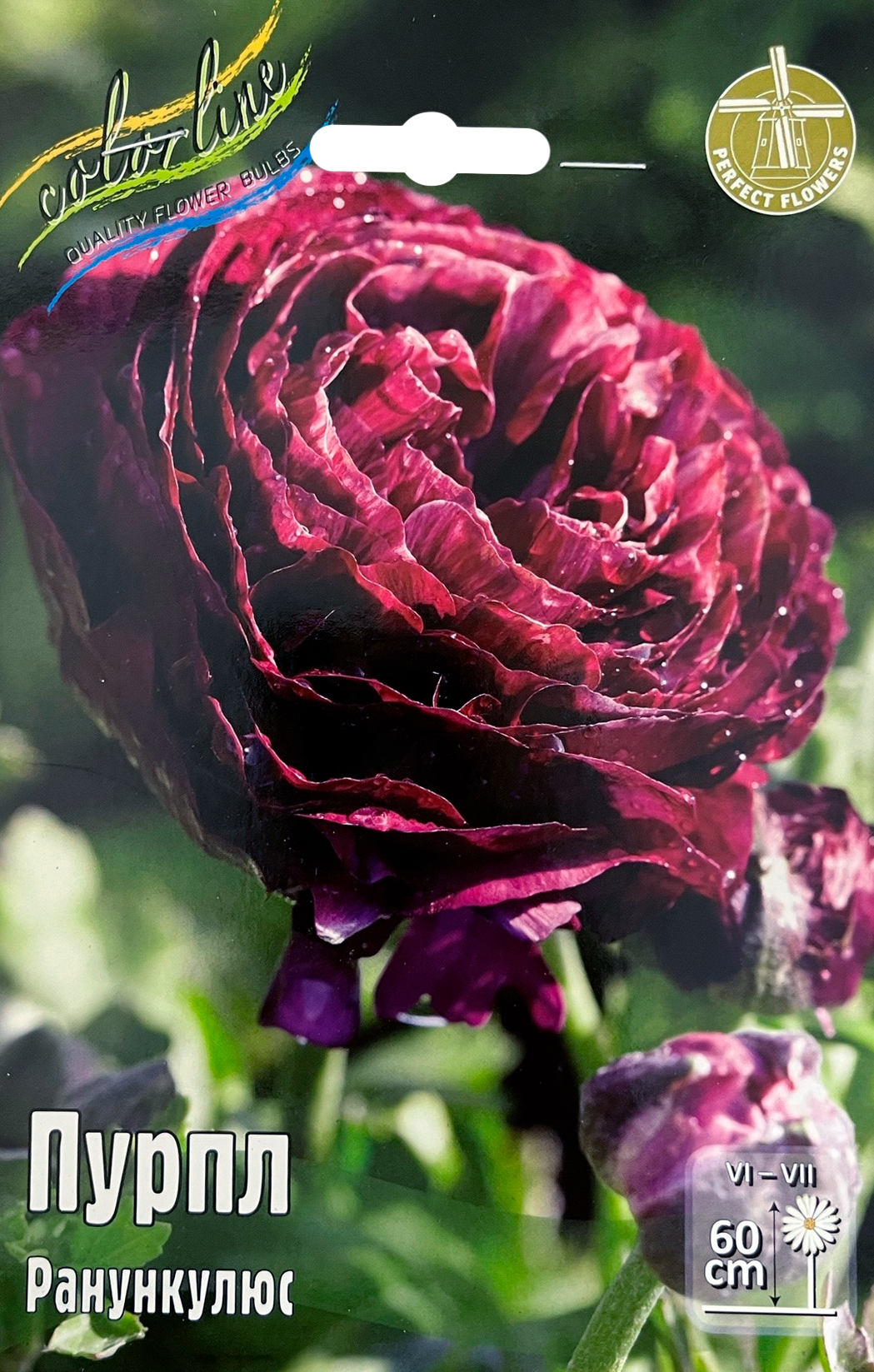Ранункулюс ПурплОтносится к группе весенних луковичных цветов. Цветки напоминают маленькие розы, а при роспуске изящные маки или пионы. Высота растения 50-60 см. Окрас: темно-лиловый, комочки диаметром до 7 см, с нежно-зеленой сердцевиной. Обладает легким, слабо уловимым ароматом. Листья тройчаторассеченые, зеленые. Цветение май-июль 2-3 недели, в срезке отлично выглядят до 10-15 дней. Посадка корешков: глубина 6-8 см, на расстоянии 10-15 см. Клубеньки высаживают коготками вниз, место соединения коготков должно быть направлено вверх, иначе лютик погибает. Почва желательна рыхлая, плодородная. Место посадки интенсивно освещенное и в полутени. Ранункулюс устойчив, как к высоким, так и к низким температурам. Размножают ранункулюсы дочерними корневищами, клубнями-детками. Сфера использования при высадке на клумбах, рабатках, в бордюре.