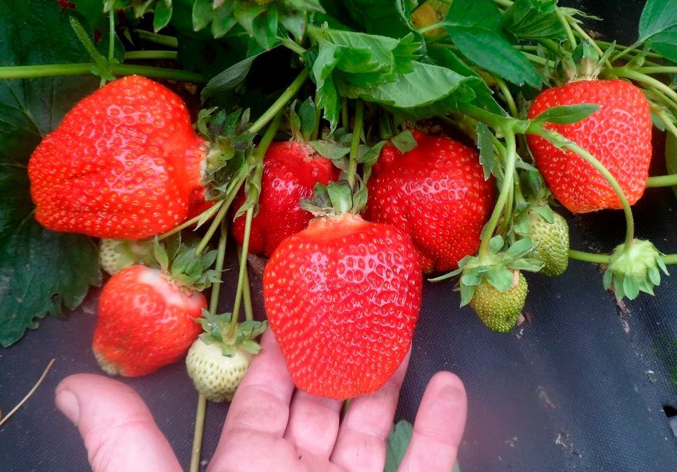 Плоды крупные, весом от 20 до 40 г, но встречаются и экземпляры в 90 г. Ягоды похожи на приплюснутый конус и имеют ярко-красный цвет. Вкус гармоничный, кисло-сладкий, с нотками земляники.