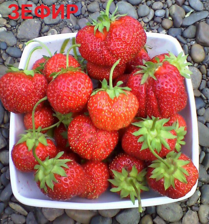 Сорт Зефир впервые появился на территории Дании, после чего распространился в Норвегии и других европейских странах. Успешное выращивание доказывает способность сорта давать хороший урожай в достаточно сложных климатических условиях.Клубника Зефир является очень ранним сортом, отличается крупными ягодами. Опушённые листья растут на компактных кустах, высота которых достигает 40-60 сантиметров. Слегка гофрированные тёмно-зеленые листовые пластины располагаются на прямостоячих стеблях длиной до 10 сантиметров. Цветоносы направляются вверх, каждый из них несёт приблизительно 15-20 бутонов. Цветоносы прочные, не гнутся под весом ягод к земле.