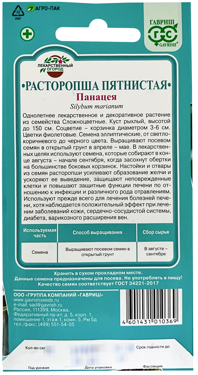 Расторопша пятнистая Панацея ГАВРИШОднолетнее лекарственное и декоративное растение семейства сложноцветные. Куст рыхлый, высотой до 150 см. Соцветие – корзинка диаметром 3-6 см. Цветки фиолетовые. Семена эллиптические, от светло-коричневого до черного цвета. Урожайность семян - 0,5-0,6 кг/м2. Не поражается болезнями, вредителями. Главным составляющим расторопши пятнистой является редкое биологически активное вещество – силимарин, кроме того, микроэлементы цинк, медь, селен, вся группа жирорастворимых витаминов, некоторые аминокислоты, всего около 200 биохимических компонентов, чем обусловлено ее многостороннее применение. Применяется, прежде всего, для лечения печени, желудка, кишечника, хотя оно прекрасно зарекомендовало себя при заболеваниях кожи, сердечно-сосудистой патологии, уха, горла, носа. Расторопшу любят за ее абсолютную безвредность, чем она и отличается от других трав. Расторопшу добавляют в кондитерские изделия, хлеб, напитки.