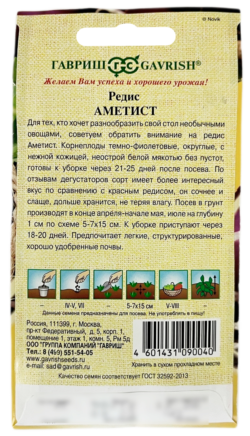 Редис АМЕТИСТ ГАВРИШДля тех, кто хочет разнообразить свой стол необычными овощами советуем обратить внимание на редис Аметист. Корнеплоды темно-фиолетовые, округлые, с нежной кожицей, неострой белой мякотью без пустот, готовы к уборке через 21-25 дней после посева. По отзывам дегустаторов сорт имеет более интересный вкус по сравнению с красным редисом, он сочнее и слаще, дольше хранится не теряя влагу. Посев в грунт производится в конце апреля-начале мая, июле на глубину 1 см по схеме 5-7x15 см. К уборке приступают через 18-20 дней. Предпочитает легкие, структурированные, хорошо удобренные почвы.