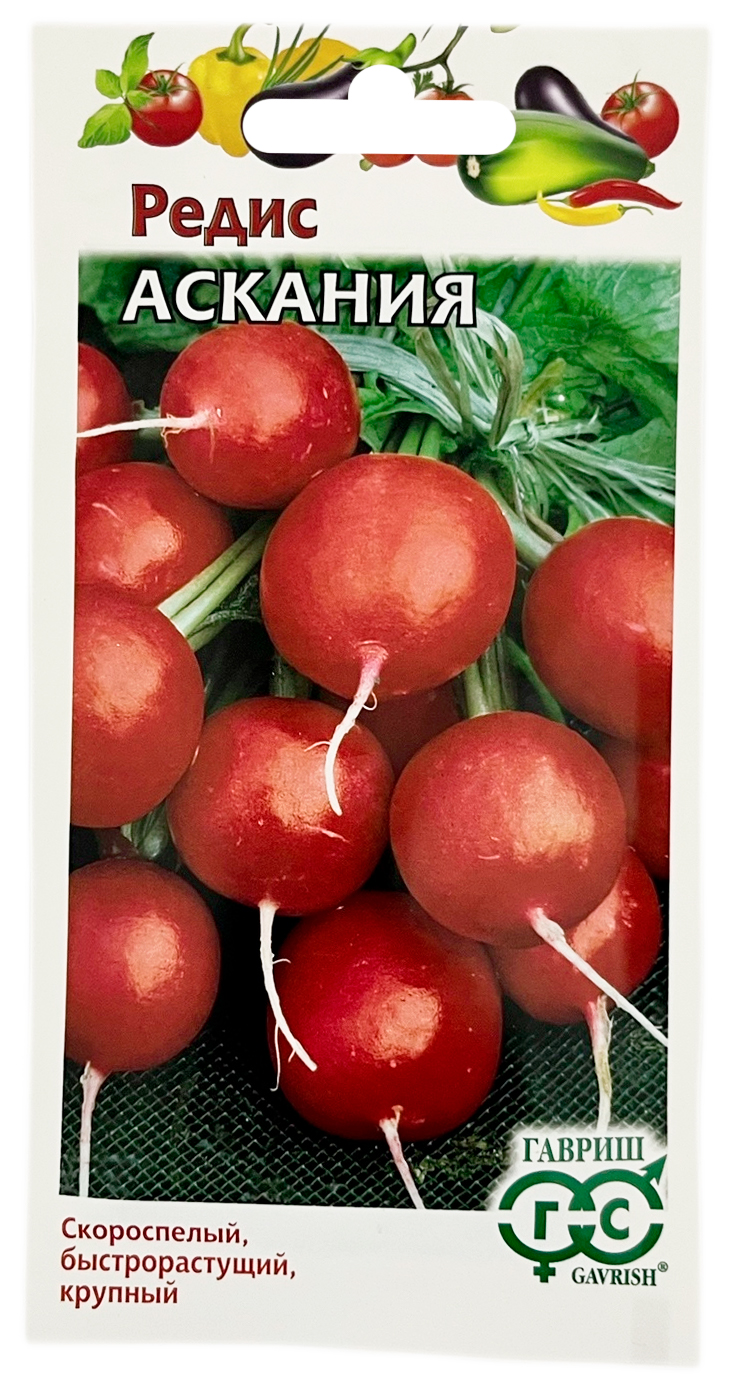 Редис Аскания ГАВРИШРаннеспелый быстрорастущий (22–24 дня от всходов до уборки урожая) сорт. Корнеплод эллиптической формы с выпуклой головкой, ярко-красный, очень крупный, интенсивно набирает массу. Мякоть белая, нежная, сочная, слабоострая. Сорт устойчив к цветушности. Имеет мощную ботву. Рекомендуется для выращивания в открытом грунте, весенних теплицах, пленочных укрытиях. Посев в открытый грунт производится в конце апреля–начале мая, повторно — с середины июля по конец августа, на глубину 1 см, по схеме 5–7х15 см. Масса товарного корнеплода 21 г. Вкусовые качества отличные. Урожайность до 1,9 кг/м2.