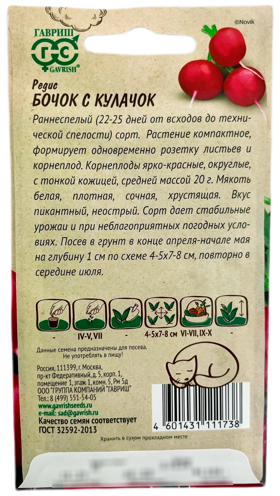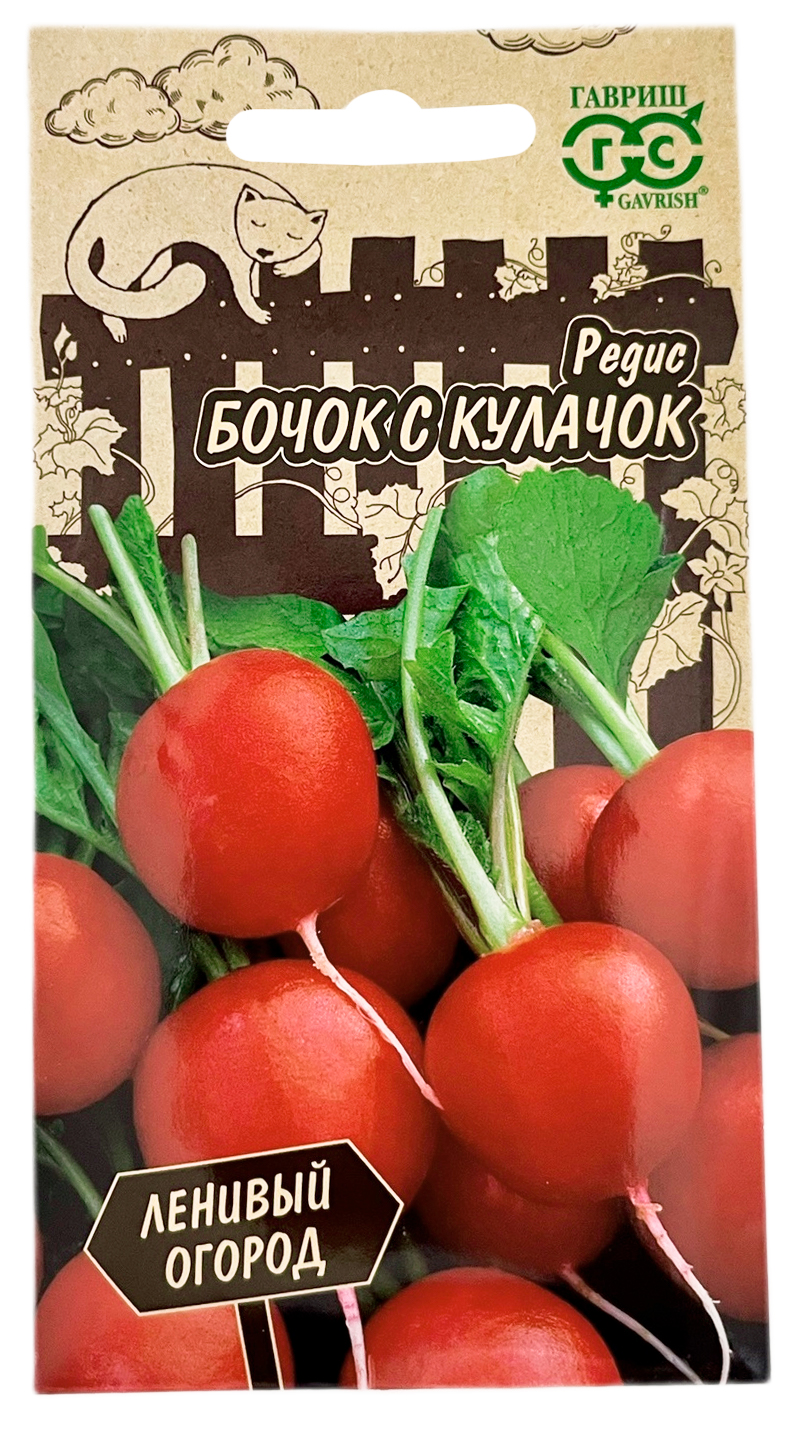 Редис Бочок с кулачок Ленивый огород ГАВРИШРаннеспелый (22-25 дней от всходов до технической спелости) сорт. Растение компактное, формирует одновременно розетку листьев и корнеплод. Корнеплоды ярко-красные округлые с тонкой кожицей, средней массой 20 г. Мякоть белая, плотная, сочная, хрустящая. Вкус пикантный неострый. Сорт дает стабильные урожаи при низкой освещенности и пониженных температурах. Посев в грунт в конце апреля – начале мая на глубину 1 см, по схеме 4—5х7— 8 см, повторно в середине июля.