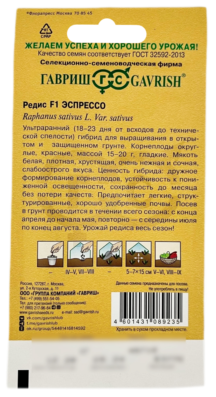 Редис Эспрессо F1 ГАВРИШУльтраранний (18-23 дня от всходов до технической спелости) гибрид для выращивания в открытом и защищенном грунте. Корнеплоды округлые, красные, массой 15-20 г, гладкие. Мякоть белая, плотная, хрустящая, очень нежная и сочная, слабоострого вкуса. Ценность гибрида: дружное формирование корнеплодов, устойчивость к пониженной освещенности, сохранность до месяца без потери качеств. Предпочитает легкие, структурированные, хорошо удобренные почвы. Посев в грунт проводится в течение всего сезона: с конца апреля до начала мая, повторно — с середины июля по конец августа. Урожай редиса весь сезон!