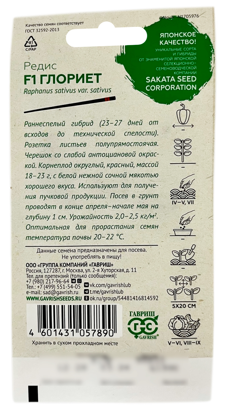 Редис ГЛОРИЕТ F1 ГАВРИШРаннеспелый сорт. Розетка листьев полупрямостоячая. Корнеплод округлый, красный, массой 18-23 г, с белой, нежной, сочной мякотью, хорошего вкуса.