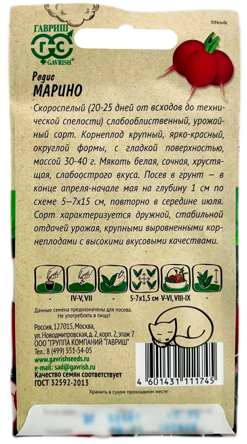 Редис Марино Ленивый огород ГАВРИШСкороспелый (20-25 дней от всходов до технической спелости) слабооблиственный, урожайный сорт. Корнеплод крупный, ярко-красный, округлой формы с гладкой поверхностью, массой 30-40 г. Мякоть белая, сочная, хрустящая, слабоострого вкуса. Посев в грунт в конце апреля – начале мая на глубину 1 см, по схеме 5—7х15 см, повторно в середине июля. Сорт характеризуется дружной, стабильной отдачей урожая, крупными выравненными корнеплодами с высокими вкусовыми качествами.