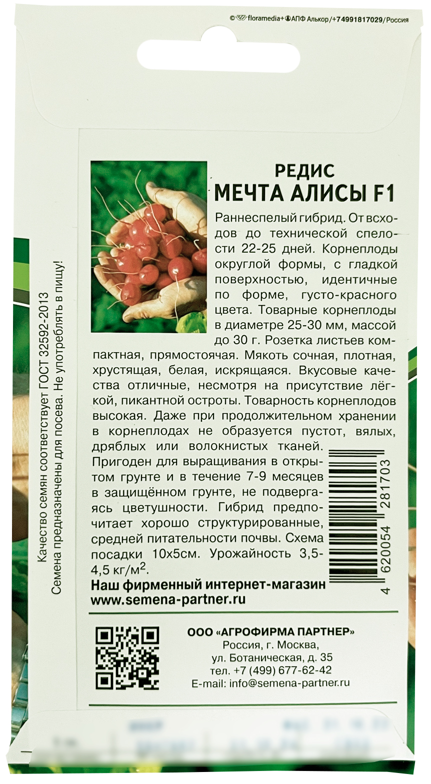 Редис Мечта Алисы F1Гибрид раннеспелый. От всходов до технической спелости 22-25 дней. Корнеплоды округлой формы, с гладкой поверхностью, идентичные по форме, густо красного цвета. Товарные корнеплоды в диаметре 25-30мм, массой до 30 г. Розетка листьев компактная, прямостоячая. Мякоть сочная плотная хрустящая белая, искрящаяся. Вкусовые качества отличные, не смотря на присутствие лёгкой, пикантной остроты. Товарность корнеплодов высокая. Даже при продолжительном хранении в корнеплодах не образуется пустот, вялых, дряблых или волокнистых тканей. Пригоден для выращивания в открытом грунте и в течение 7- 9 месяцев в защищённом грунте, не подвергаясь цветушности. Гибрид предпочитает хорошо структурированные, средней питательности почвы. Сбор корнеплодов облегчается за счёт неглубокого нахождения в почве. Схема посадки 10х5см. Урожайность 3,5-4,5 кг/м2.