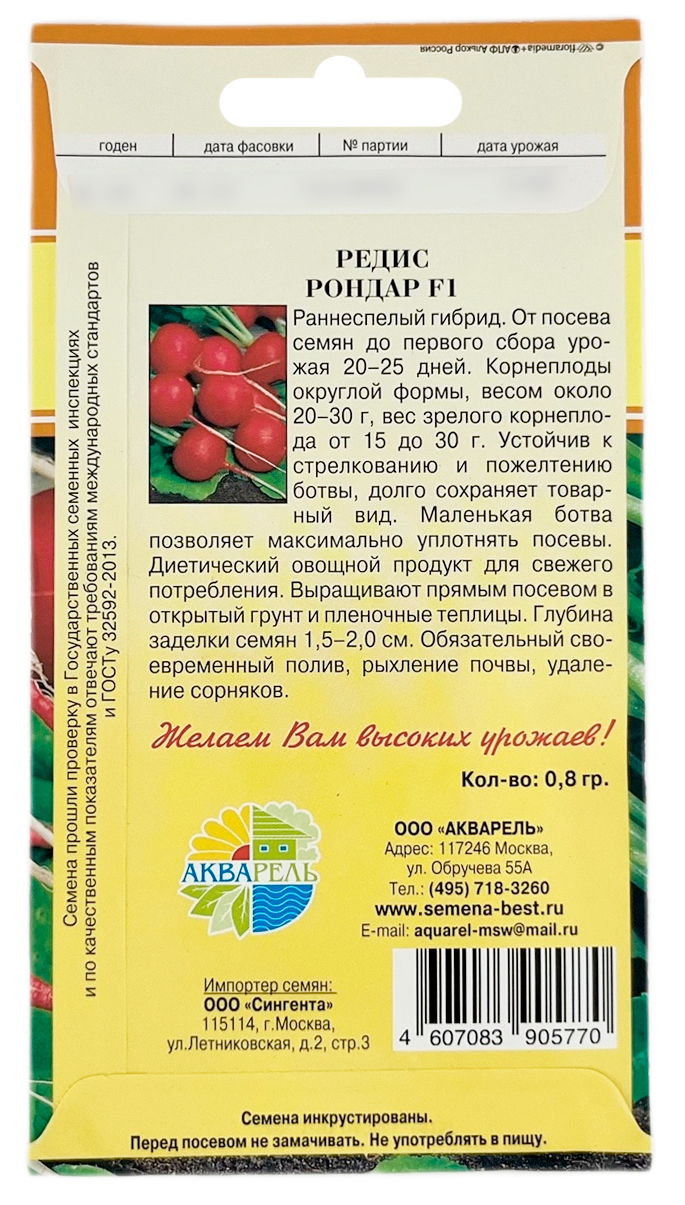 Редис Рондар F1 АКВАРЕЛЬРаннеспелый гибрид. От посева семян до первого сбора урожая 20-25 дней. Корнеплоды округлой формы, весом около 20-30 г, вес зрелого корнеплода от 15 до 30 г. Устойчив к стрелкованию и пожелтению ботвы, долго сохраняет товарный вид. Маленькая ботва позволяет максимально уплотнять посевы. Диетический овощной продукт для свежего потребления. Выращивают прямым посевом в открытый грунт и пленочные теплицы. Глубина заделки семян 1,5-2,0 см. Обязательный своевременный полив, рыхление почвы, удаление сорняков.
