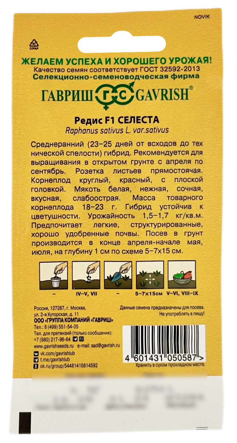 Редис Селеста F1 ГАВРИШСреднеранний (23-25 дней от всходов до технической спелости) гибрид. Рекомендуется для выращивания в открытом грунте с апреля по сентябрь. Розетка листьев прямостоячая. Корнеплод круглый, красный, с плоской головкой. Мякоть белая, нежная, сочная, вкусная, слабоострая. Масса товарного корнеплода 18-23 г. Гибрид устойчив к цветушности. Урожайность — 1,5-1,7 кг/м2. Предпочитает легкие, структурированные, хорошо удобренные почвы. Посев в грунт производится в конце апреля – начале мая на глубину 1 см по схеме 5-7x15 см.