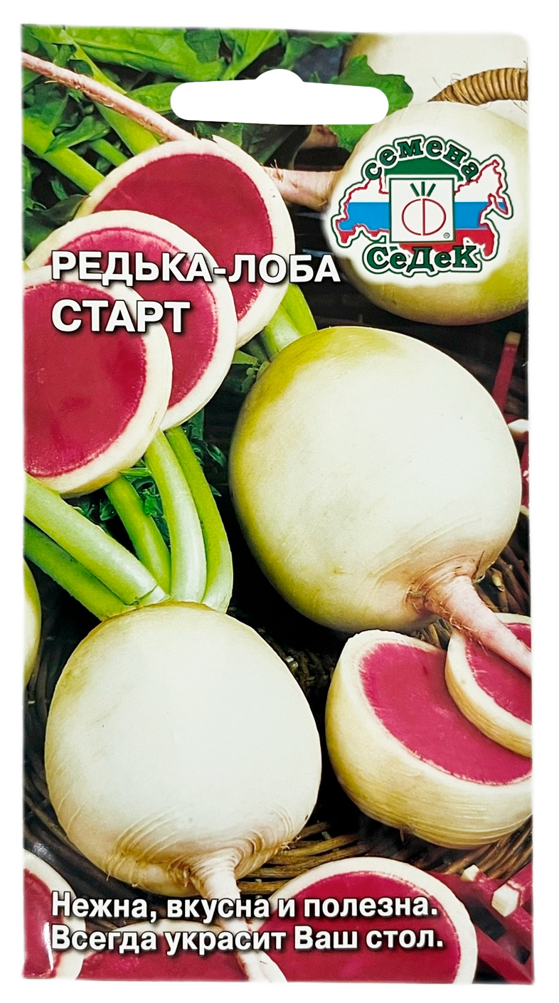 Редька лоба СТАРТ СеДеКРаннеспелый гибрид китайской редьки (лоба) с оригинальной окраской мякоти. Корнеплоды выравненные, округлые, светло-зеленые, почти белые. Мякоть розово-красная, сочная, слабоостро-сладкого вкуса, без грубых волокон. Ценность гибрида: высокая урожайность и товарность корнеплодов, пригодность для длительного хранения. Рекомендуется для употребления в свежем виде, как деликатесная закуска к праздничному столу, для приготовления свежих салатов.