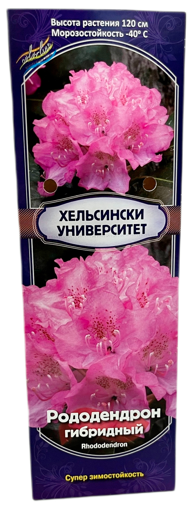Рододендрон гибридный Хельсински Университет Rhododendron Helsinki UniversitätНаиболее известный гибрид финской селекции. Зимостойкий. Способен также выдерживать повышенную влажность и перепады температур. Теневыносливый. Цветёт с июня светло-розовыми с оранжевым пятном на верхнем лепестке и темно-бордовым крапом поверх него цветками. В соцветиях по 12-18 шт.