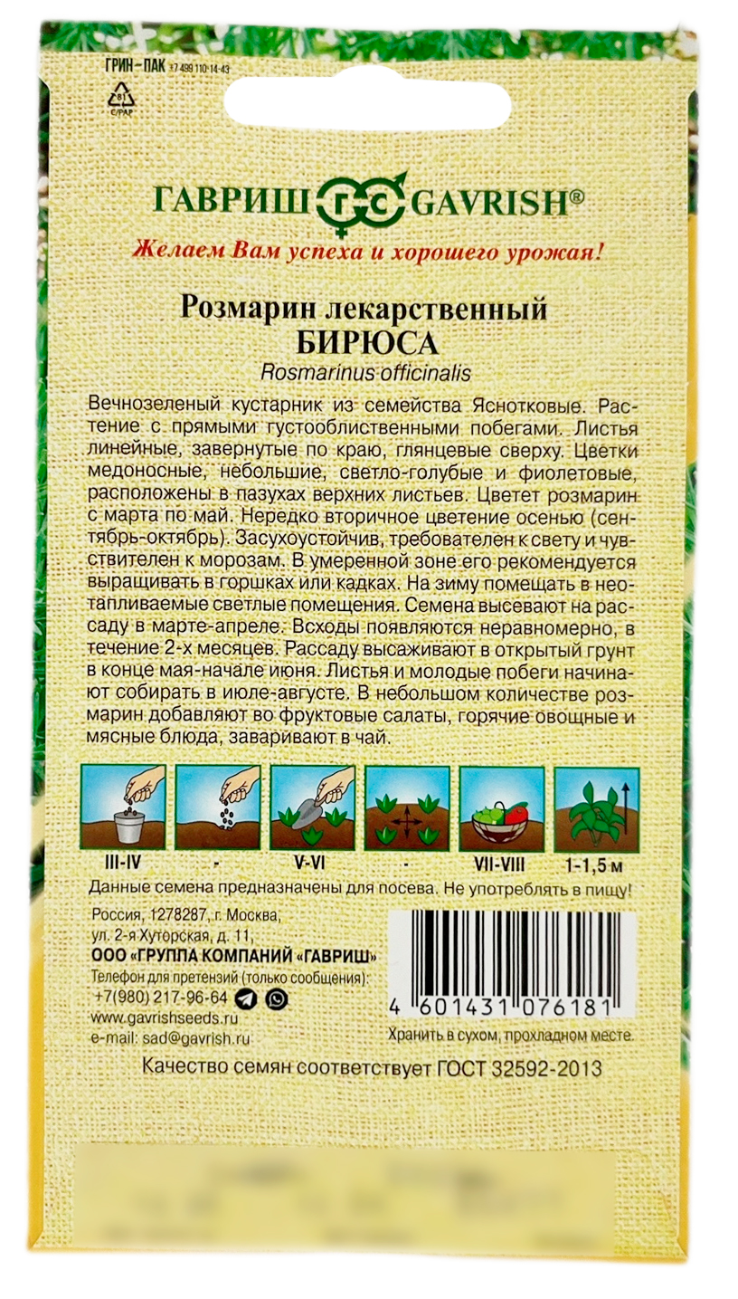 -Розмарин Бирюса 0,05 г автор. семенаКаперсПижмаХренАлтейАмарант ОвощнойАнисБазиликБергамотБессмертникБорагоВалерианаДонникДушевникДушицаЗверобойЗмееголовникИссопКатранКервельКозлятникКориандрКотовникКровохлебка семенаКуминЛаванда семенаЛимонная трава ЦитронеллаЛопухЛофантЛюбистокЛюффаЛядвенецМайоранМелиссаМикрозелень семенаМомордикаМонарда семенаМыльнянкаМятаНаборы травОвсяный кореньОреганоПажитникПастернакПериллаПетрушкаПодорожникПортулак овощнойПустырникРасторопшаРепешокРомашка лекарственнаяРутаСалатСельдерейСкорцонераСкрытницаСолодкаСпилантесСтевияТабак курительный семенаТимьянТминТысячелистник лекарственныйУкропФенхельЦикорийЦиноглоссумЧаберЧередаЧернокореньШалфейШпинатЩавельЭстрагонЭхинацея лечебная семена