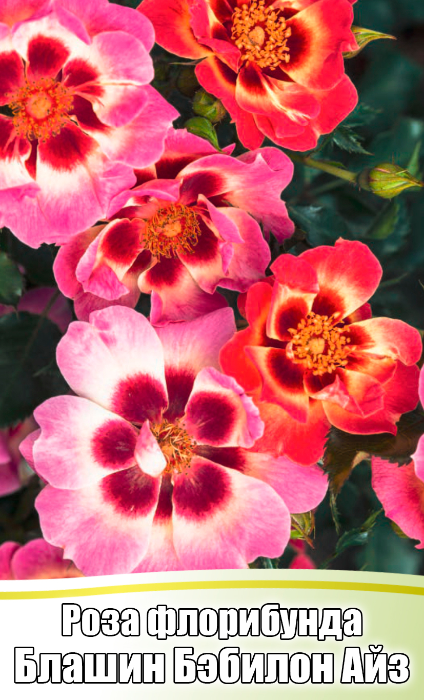 Роза Блашин Бэбилон Айз Rose Blushing Babylon EyesРоза группы флорибунда, обильноцветущая. Растение с раскидистыми ветвями, в высоту достигающими от 70 до 80 сантиметров. Цветки простые диаметром 6 см, розовые с жёлтым глазком вокруг тёмно-красного пятна в основании лепестков. Тональность цветков в процессе цветения меняется. Повторно цветущая, период цветения длится с июня до ноября. Используется для посадки в контейнер и как бордюрные розы. Для высадки предпочтительны маловетреные участки с не закисленным, рассыпчатым грунтом. Растение устойчиво к таким заболеваниям, как мучнистая роса и чёрная пятнистость.