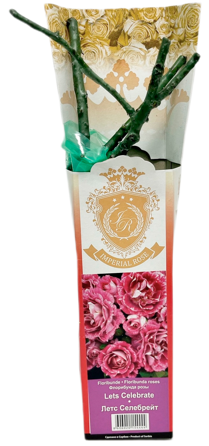 Роза флорибунда ЛЕТС СЕЛЕБРЕЙТ (LETS CELEBRATE)Аккуратный и компактный куст в высоту до 90 см, в ширину до 60 см. Небольшое количество острых шипов. Экзотический бело - розовый окрас. Димаетр бутона до 8 см. Морозостойкая.