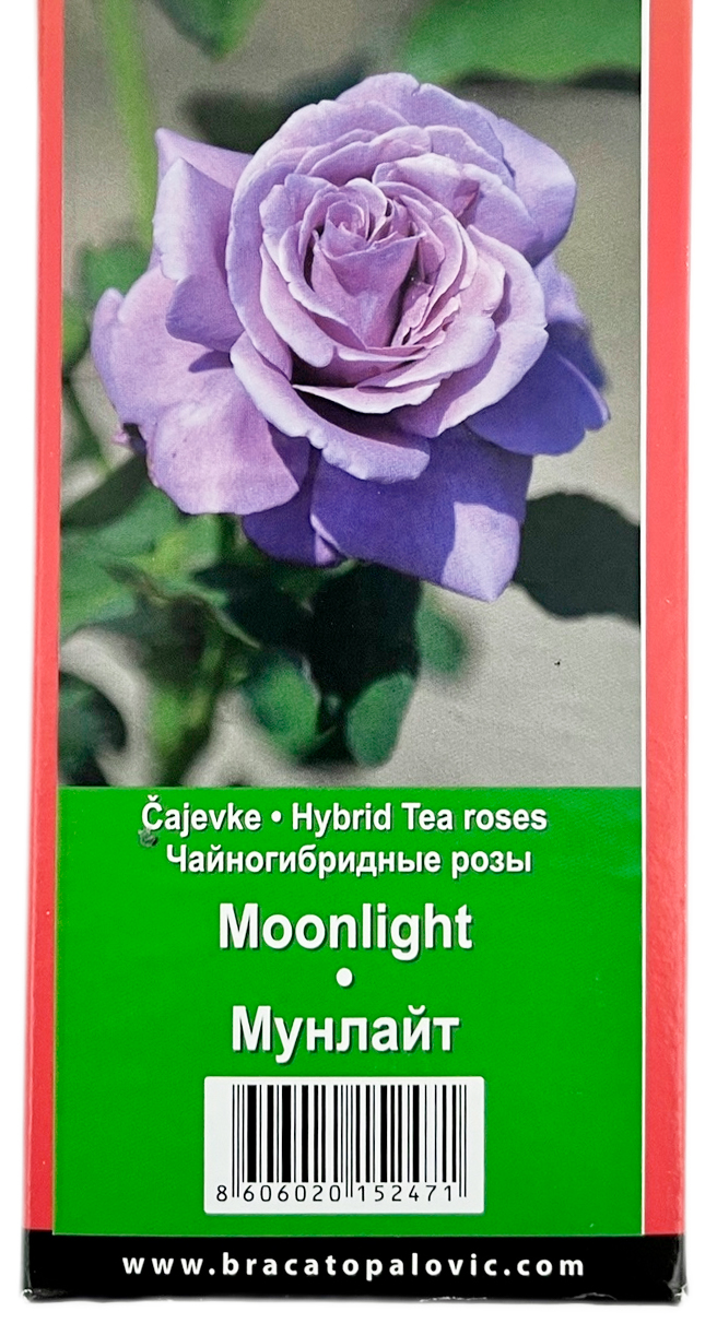 Чайногибридная роза МУНЛАЙТ (MOONLIGHT)Мощное, сильнорослое растение до 2,5 метра в высоту. За счет раскидистости ветвей куст выглядит пышно (до 120 см в диаметре). Мунлайт вызывает восторг своей невероятно красивой расцветкой. Хорошо переносит жару и холод, обильное и длительное цветение на протяжении всего сезона. Светло - фиолетовая махровая роза с рыхлой сердцевиной.