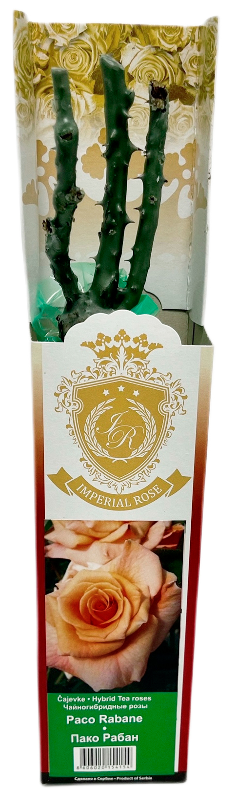 Чайногибридная роза ПАКО РАБАН (PACO RABANE)Окраска: темно-абрикосовая, иногда насыщенно персиковая. Форма бутона удлиненная, махровая, а форма цветка классическая. Диаметр цветка до 10 см.