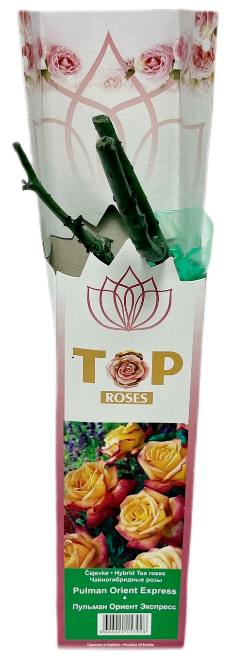 Чайногибридная роза ПУЛЬМАН ОРИЕНТ ЭКСПРЕСС (PULMAN ORIENT EXPRESS)Высокие кусты до 180 см. Прямые и прочные побеги. Бокаловидные бутоны жёлто-лососевого окраса. В полном раскрытии проявляется истинная красота розы. Крупные густомахровые цветы в диаметре до 15 см.
