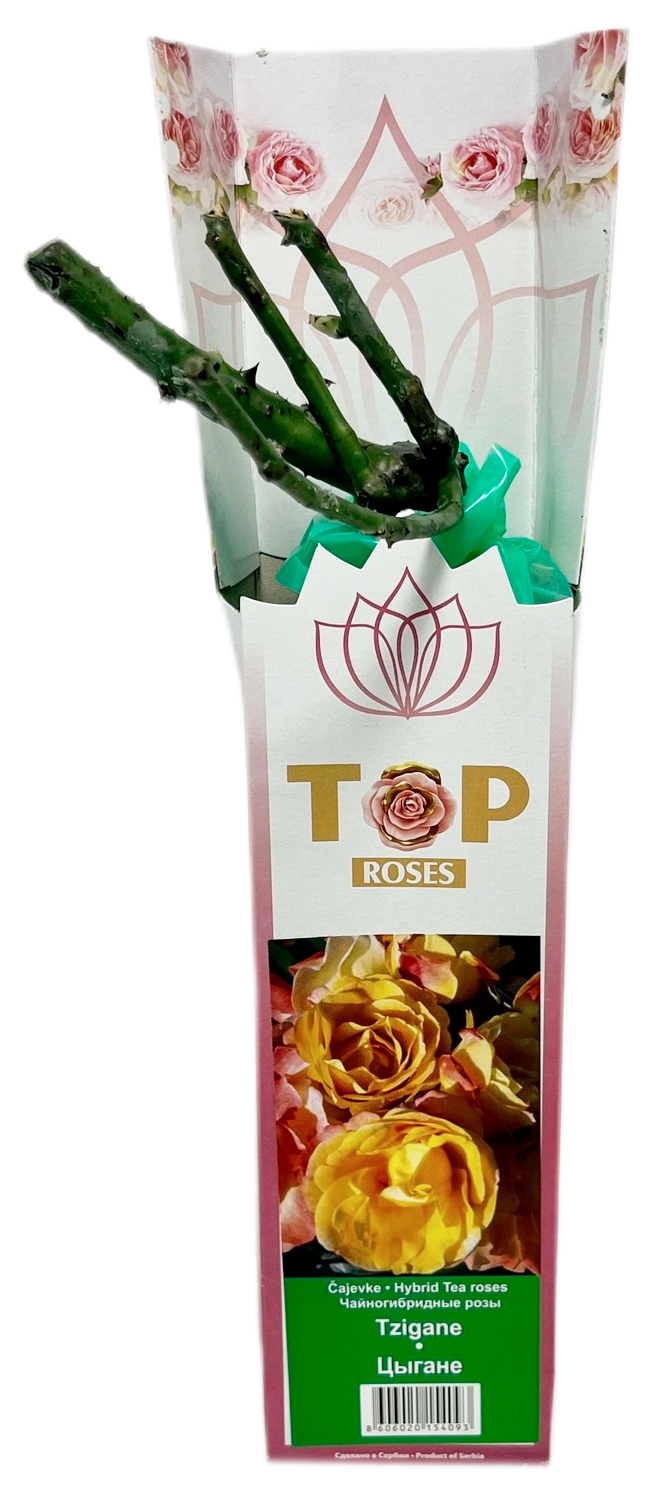 Чайногибридная роза ЦЫГАНЕ (TZIGANE)Компактный, пышный и мощный куст до 80 см в высоту, до 60 см в диаметре. Прямостоячие побеги, умеренная ветвистость. Весной на крепких и прямых побегах формируются бутоны, собранные в соцветия по 3-5 единиц. Окрас – желто-розовый, нежно-лососевого.