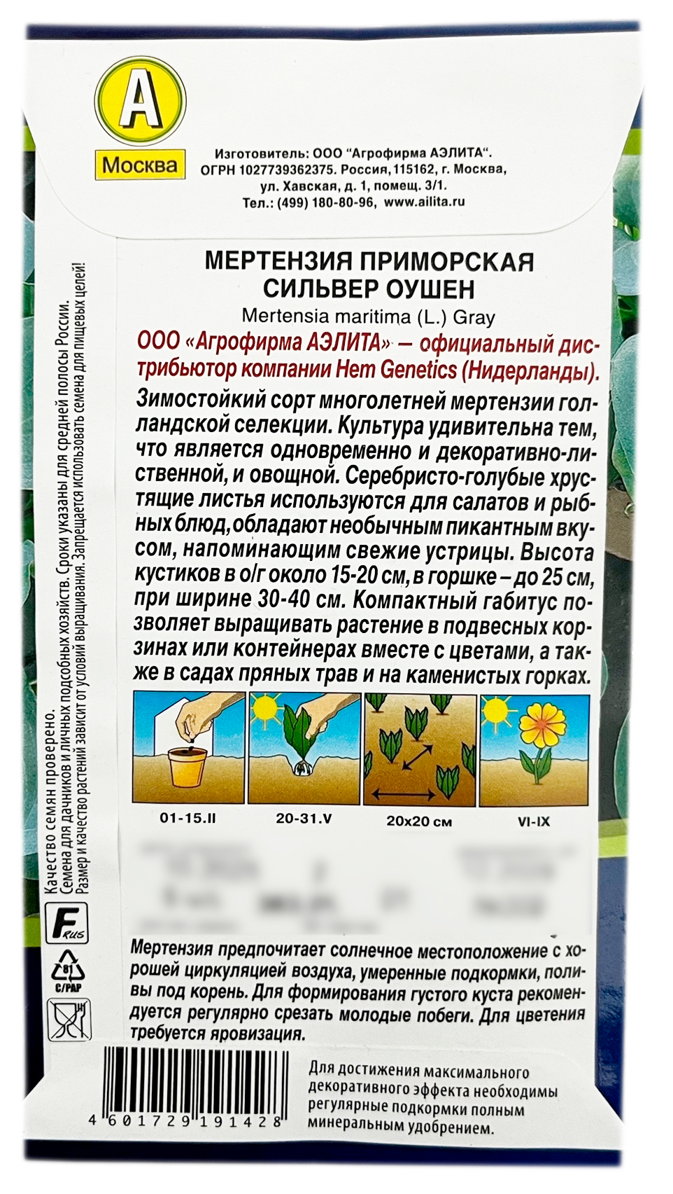 Мертензия приморская СИЛЬВЕР ОУШЕН АЭЛИТАЗимостойкий сорт многолетней мертензии голландской селекции. Культура удивительна тем, что является одновременно и декоративно-лиственной, и овощной. Серебристо-голубые хрустящие листья используются для салатов и рыбных блюд, обладают необычным пикантным вкусом, напоминающим свежие устрицы. Высота кустиков в о/г около 15-20 см, в горшке – до 25 см, при ширине 30-40 см. Компактный габитус позволяет выращивать растение в подвесных корзинах или контейнерах вместе с цветами, а также в садах пряных трав и на каменистых горках.