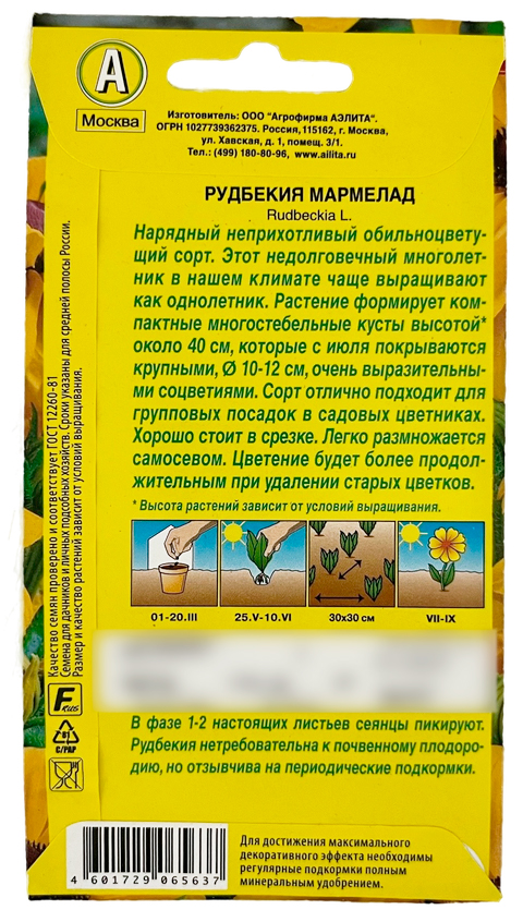Рудбекия МАРМЕЛАД АЭЛИТАНарядный, неприхотливый, обильноцветущий сорт. Этот недолговечный многолетник в нашем климате чаще выращивают как однолетник. Растение формирует компактные, много стебельные кусты высотой* около 40 см, которые с июля покрываются крупными, ? 10-12 см, очень выразительными соцветиями. Сорт отлично подходит для групповых посадок в садовых цветниках. Хорошо стоит в срезке. Легко размножается самосевом. Цветение будет более продолжительным при удалении старых цветков.