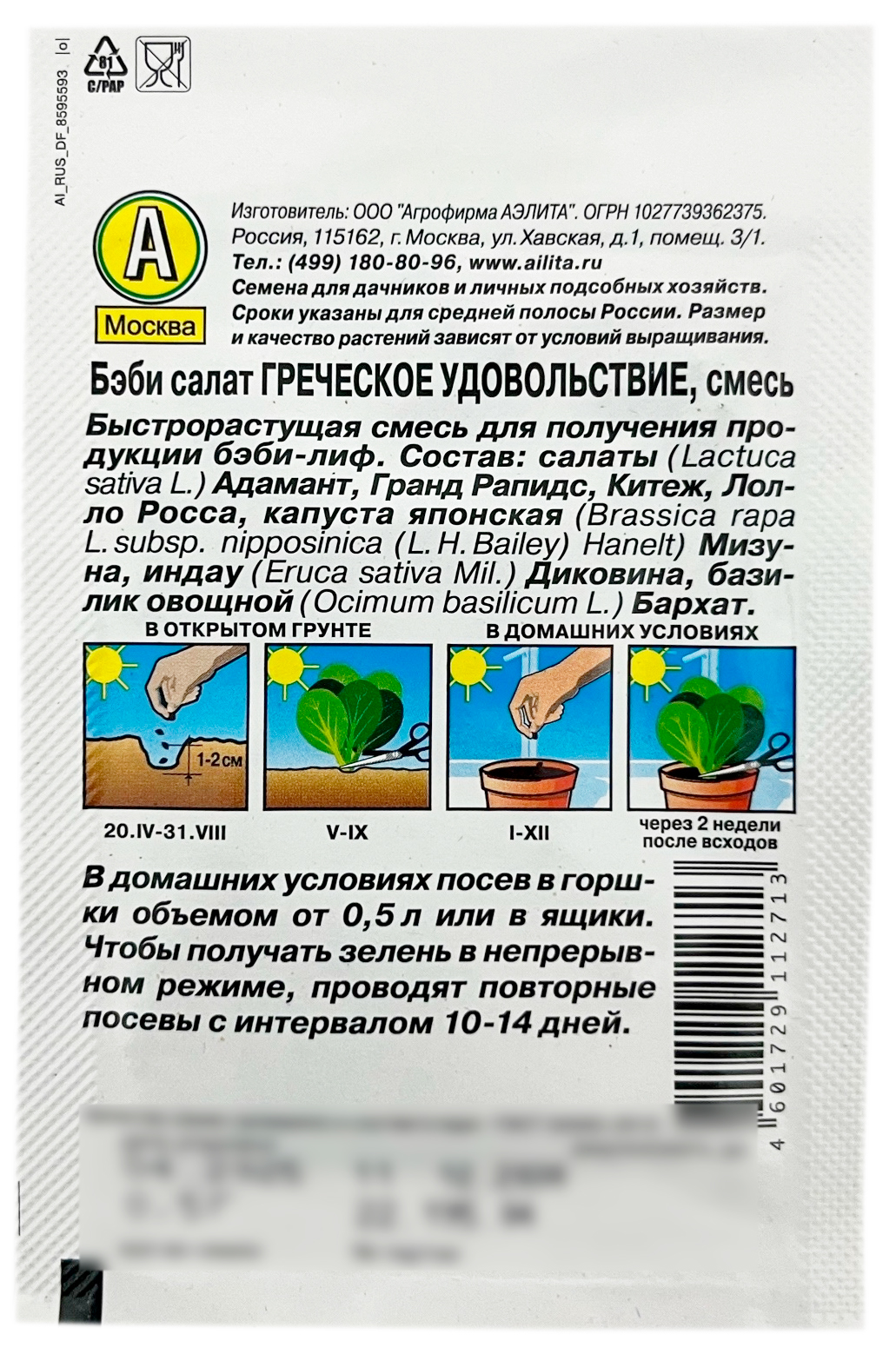 Бэби салат ГРЕЧЕСКОЕ УДОВОЛЬСТВИЕ смесь АЭЛИТАБыстрорастущая смесь для получения продукции бэби-лиф. Состав: салаты (Lactuca sativa L.) Адамант, Гранд Рапидс, Китеж, Лолло Росса, капуста японская (Brassica rapa L. subsp. nipposinica (L. H. Bailey) Hanelt) Мизуна, индау (Eruca sativa Mil.) Диковина, базилик овощной (Ocimum basilicum L.) Бархат.