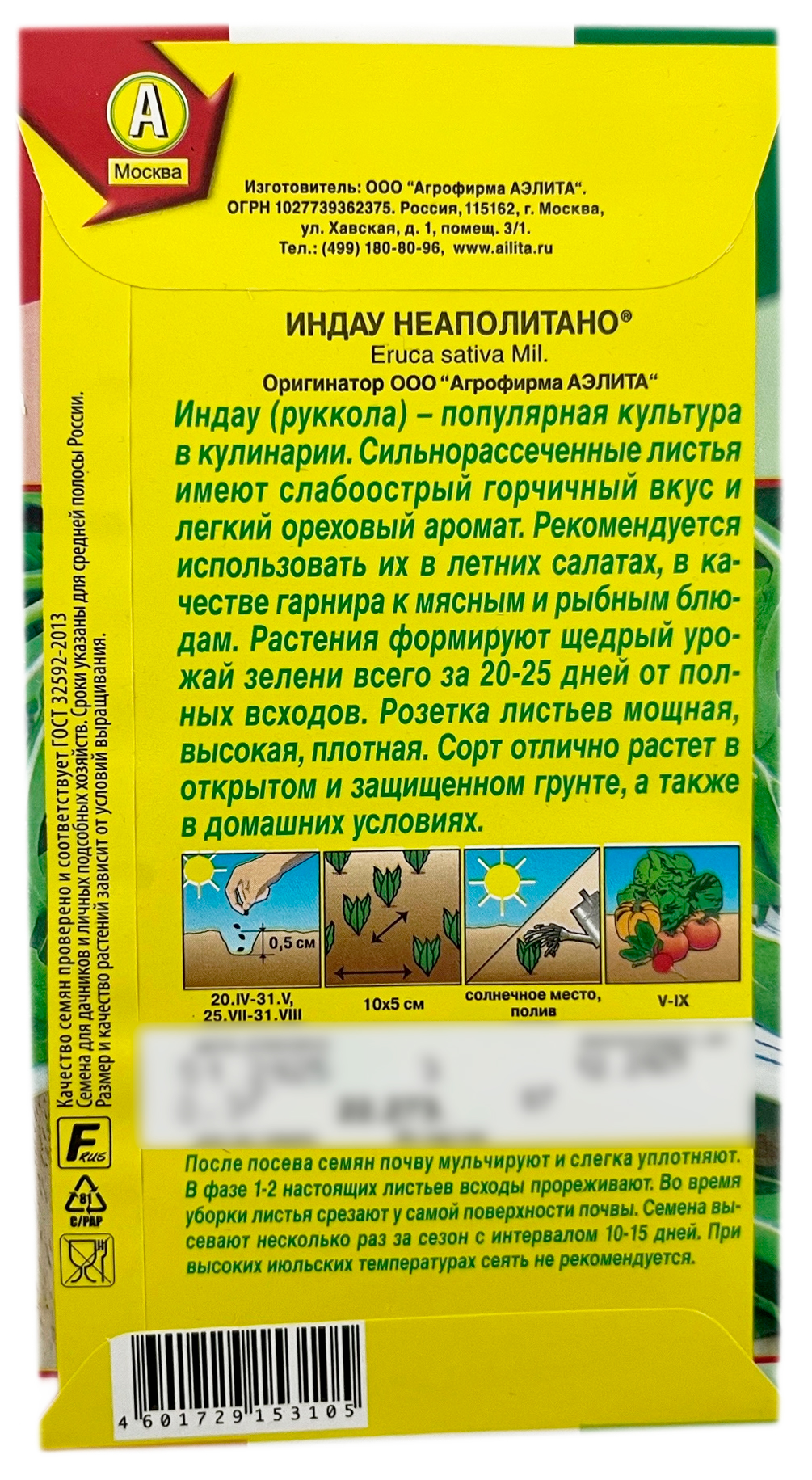 Индау НЕАПОЛИТАНО АЭЛИТАИндау (руккола) – популярная культура в кулинарии. Формирует урожай зелени за 20-25 дней от всходов. Сильнорассеченные листья имеют слабо-острый горчичный вкус и легкий ореховый аромат. Рекомендуется использовать молодые листочки в летних салатах, в качестве гарнира к мясным и рыбным блюдам. Розетка листьев мощная, высокая, массой 25-30 г. Отлично растет в открытом и защищенном грунте, а также в домашних условиях.