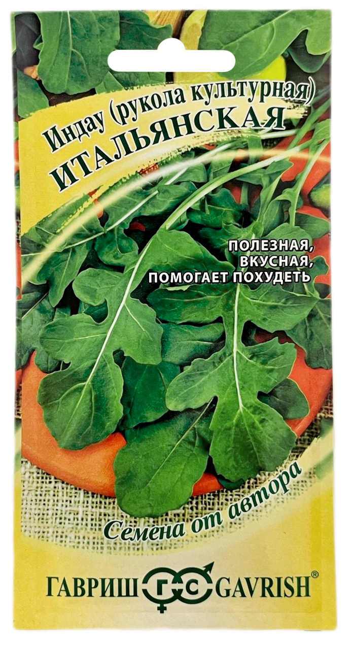 Индау ИТАЛЬЯНСКАЯ ГАВРИШПопулярная в последнее время зелень руколы нравится гурманам и ценителям итальянской кухни за свой очень приятный горчично-оливковый вкус, который так выгодно оттеняет морепродукты в теплых салатах или добавляет в салат из свежих овощей свой особенный акцент. Несомненным достоинством этой зеленной культуры является быстрые сроки созревания, всего 20-25 дней проходит от появления всходов до первой уборки урожая. Рукола верный спутник для желающих похудеть, она низкокалорийная, содержит много витаминов группы В, витамин Р, способствует нормализации пищеварения. Посев семян производят с апреля по август непосредственно в грунт, на глубину 1 см. Растение неприхотливо. Предназначено для выращивания в открытом грунте, под пленочными укрытиями, в качестве горшечной культуры на подоконнике. Урожайность 1-1,3 кг/м2.