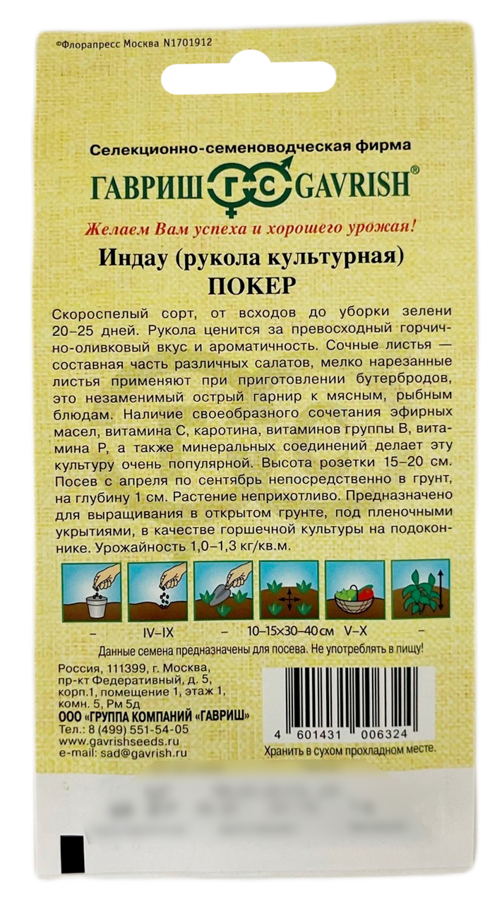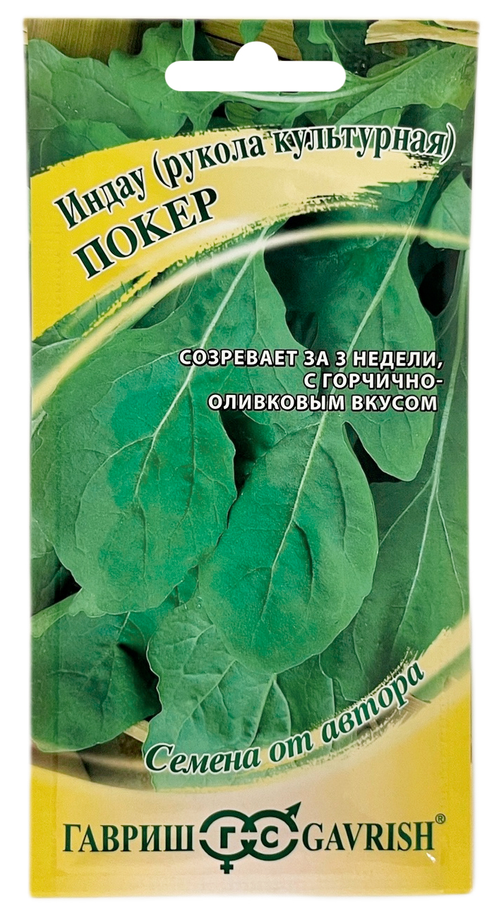 Индау ПОКЕР ГАВРИШСкороспелый сорт, от всходов до уборки зелени 20-25 дней. Рукола ценится за превосходный орехово-горчичный вкус. Сочные листья - составная часть различных салатов, мелко нарезанные листья применяют при приготовлении бутербродов, это незаменимый острый гарнир к мясным, рыбным блюдам. Наличие своеобразного сочетания эфирных масел, витамина С, каротина, витаминов группы В, витамина Р, а также минеральных соединений делает эту культуру очень популярной. Высота розетки 15-20см. Посев с апреля по август непосредственно в грунт, на глубину 1 см. Растение неприхотливо. Предназначено для выращивания в открытом грунте, под пленочными укрытиями, в качестве горшечной культуры на подоконнике. Урожайность 1-1,3 кг/м2.