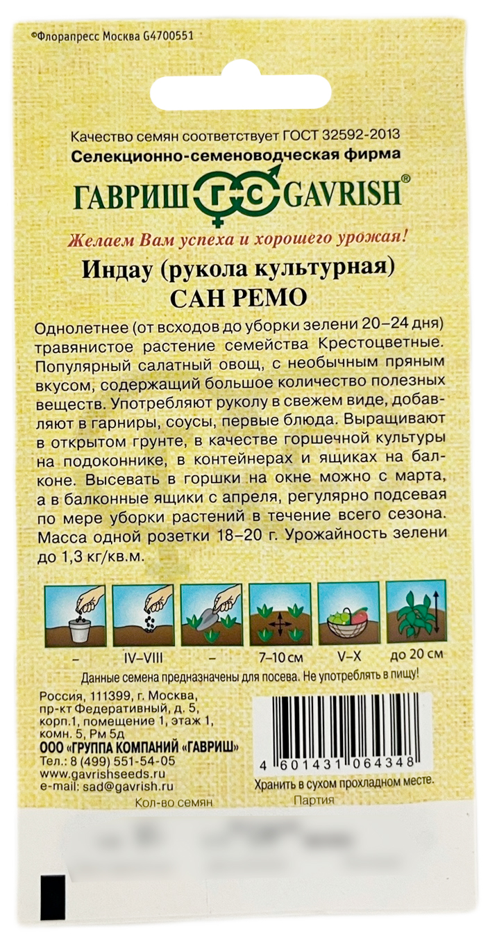 Индау рукола культурная САН РЕМО ГАВРИШОднолетнее (от всходов до уборки зелени 20-24 дня) травянистое растение семейства Капустные. Популярный салатный овощ, с необычным пряным вкусом, содержащий большое количество полезных веществ. Употребляют руколу в свежем виде, добавляют в гарниры, соусы, первые блюда. Выращивают в открытом грунте, в качестве горшечной культуры на подоконнике, в контейнерах и ящиках на балконе. Высевать в горшки на окне можно с марта, а в балконные ящики с апреля, регулярно подсевая по мере уборки растений в течение всего сезона. Масса одной розетки 18-20 г. Урожайность зелени до 1,3 кг/м2.