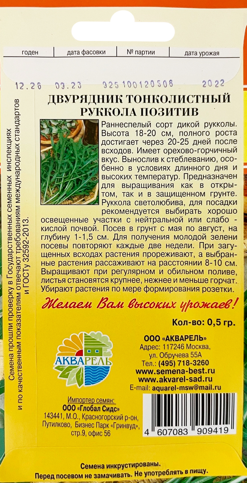 Двурядник тонколистный Руккола ПозитивРаннеспелый сорт дикой рукколы. Высота 18-20 см, полного роста достигает через 20-25 дней после всходов. Имеет орехово-горчичный вкус. Вынослив к стеблеванию, осо- бенно в условиях длинного дня и высоких температур. Предназначен для выращивания как в открытом, так и в защищенном грунте. Руккола светолюбива, для посадки рекомендуется выбирать хорошо освещенные участки с нейтральной или слабо - кислой почвой. Посев в грунт с мая по август, на глубину 1-1,5 см. Для получения молодой зелени посевы повторяют каждые две недели. При загущенных всходах растения прореживают, а выбран- ные растения рассаживают на расстоянии 8-10 см. Выращивают при регулярном и обильном поливе, листья становятся крупнее, нежнее и меньше горчат. Убирают растения по мере формирования розетки.