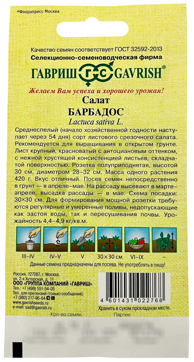 Салат БарбадосСреднеспелый (начало хозяйственной годности наступает через 54 дня) сорт листового срезочного салата. Рекомендуется для выращивания в открытом грунте. Лист крупный, красноватый с антоциановым оттенком, с нежной хрустящей консистенцией листьев, складчатой поверхностью. Розетка полуприподнятая, высотой 30 см, диаметром 28-32 см. Масса одного растения 420 г. Вкус отличный. Посев семян непосредственно в грунт в апреле - мае. На рассаду высевают в марте - апреле, высадка рассады – в мае. Схема посадки 30x30 см. Для формирования мощной розетки требуются регулярные и умеренные поливы, не допускающие как застоя воды, так и пересушивания почвы. Урожайность 4,4-4,9 кг/м2.