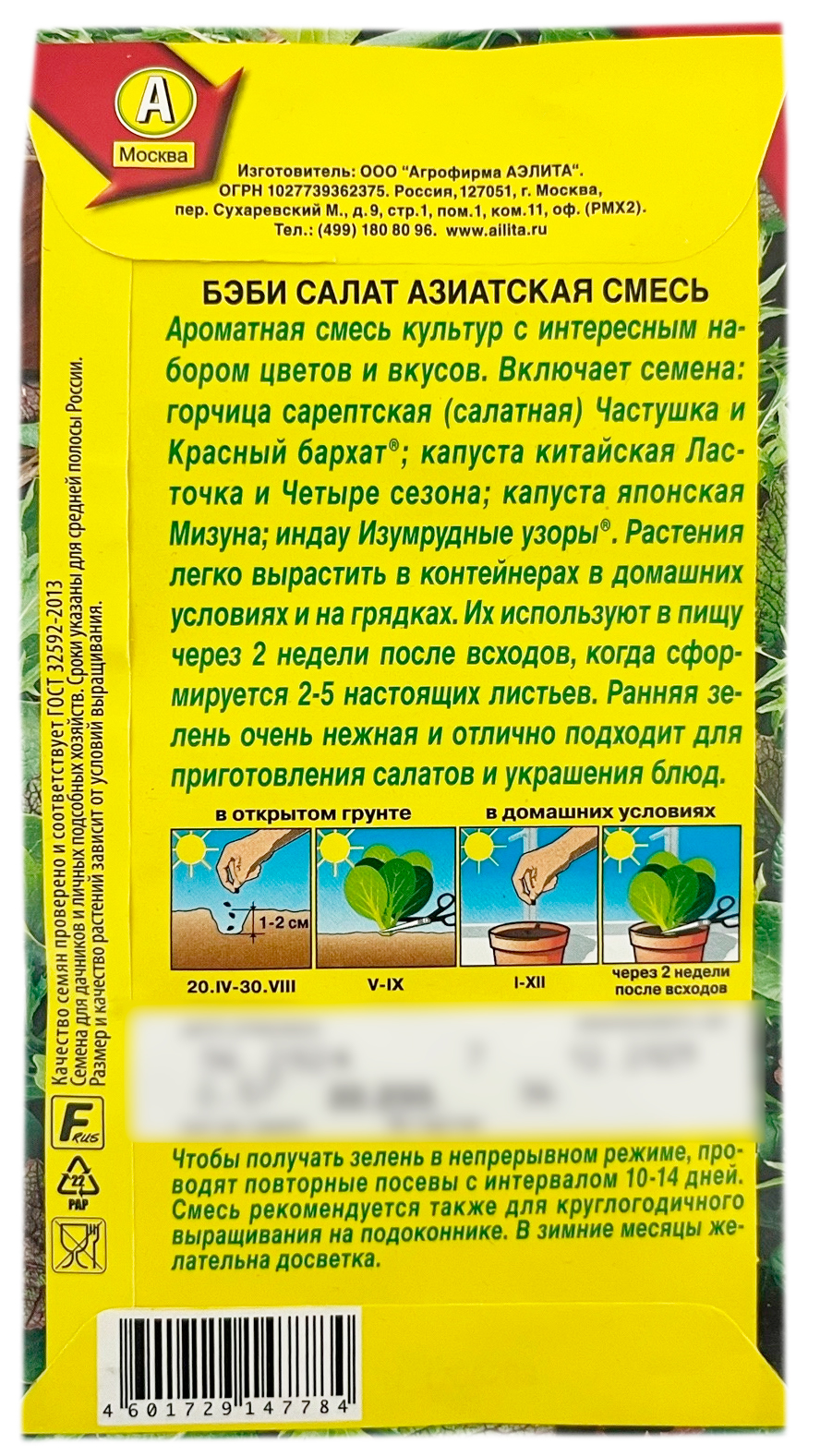 Бэби салат АЗИАТСКАЯ СМЕСЬ АЭЛИТААроматная смесь культур с интересным набором цветов и вкусов. Включает семена: горчица сарептская (салатная) (Brassica juncea (L.) Czern.) Частушка и Красный бархат®; капуста китайская (Brassica chinensis L.) Ласточка и Четыре сезона; капуста японская (Brassica rapa L. subsp. nipposinica (L. H. Bailey) Hanelt) Мизуна; индау (Eruca sativa Mil.) Изумрудные узоры. Растения легко вырастить в контейнерах в домашних условиях и на грядках. Их используют в пищу через 2 недели после всходов, когда сформируется 2-5 настоящих листьев. Ранняя зелень очень нежная и отлично подходит для приготовления салатов и украшения блюд.