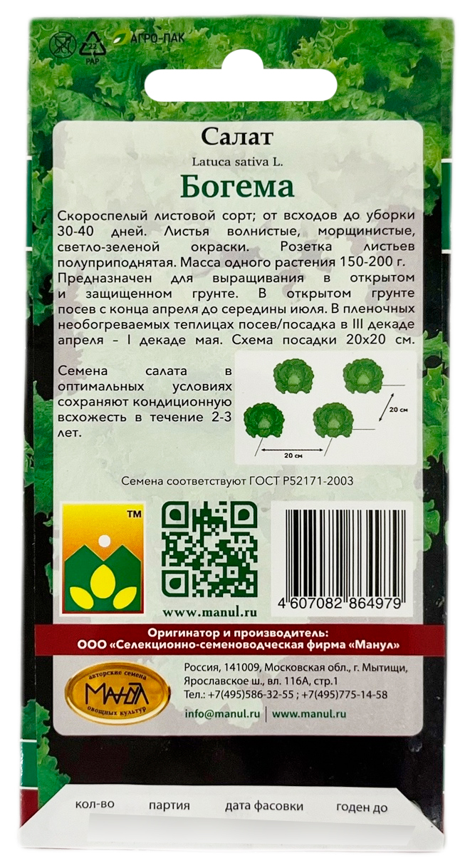 Салат Богема МАНУЛСкороспелый листовой сорт; от всходов до уборки 30-40 дней. Листья волнистые, морщинистые, светло-зеленой окраски. Розетка листьев полуприподнятая. Масса одного растения 150-200 г. Предназначен для выращивания в открытом и защищенном грунте. В открытом грунте посев с конца апреля до середины июля. В пленочных необогреваемых теплицах посев/посадка в III декаде апреля — I декаде мая. Схема посадки 20×20 см.