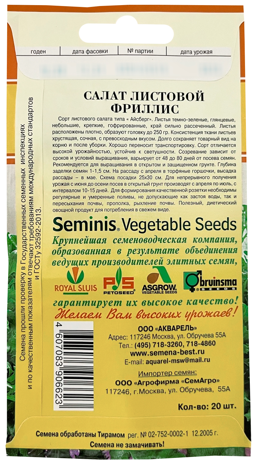 Салат листовой Фриллис АКВАРЕЛЬСорт листового салата типа "Айсберг". Листья темно-зеленые, глянцевые, небольшие, крепкие, гофрированные, край сильно рассеченный. Листья расположены плотно, образуют головку до 250 гр. Консистенция ткани листьев хрустящая, сочная, с превосходным вкусом. Долго сохраняет товарный вид на корню и после уборки. Хорошо переносит транспортировку. Сорт отличается высокой урожайностью, устойчив к светушности. Созревание зависит от сроков и условий выращивания, варьирует от 48 до 80 дней от посева семян. Выращивают прямым посевом в грунт. Рекомендуется рыхление, прополка и регулярные поливы. Полезный, диетический овощной продукт для потребления в свежем виде.