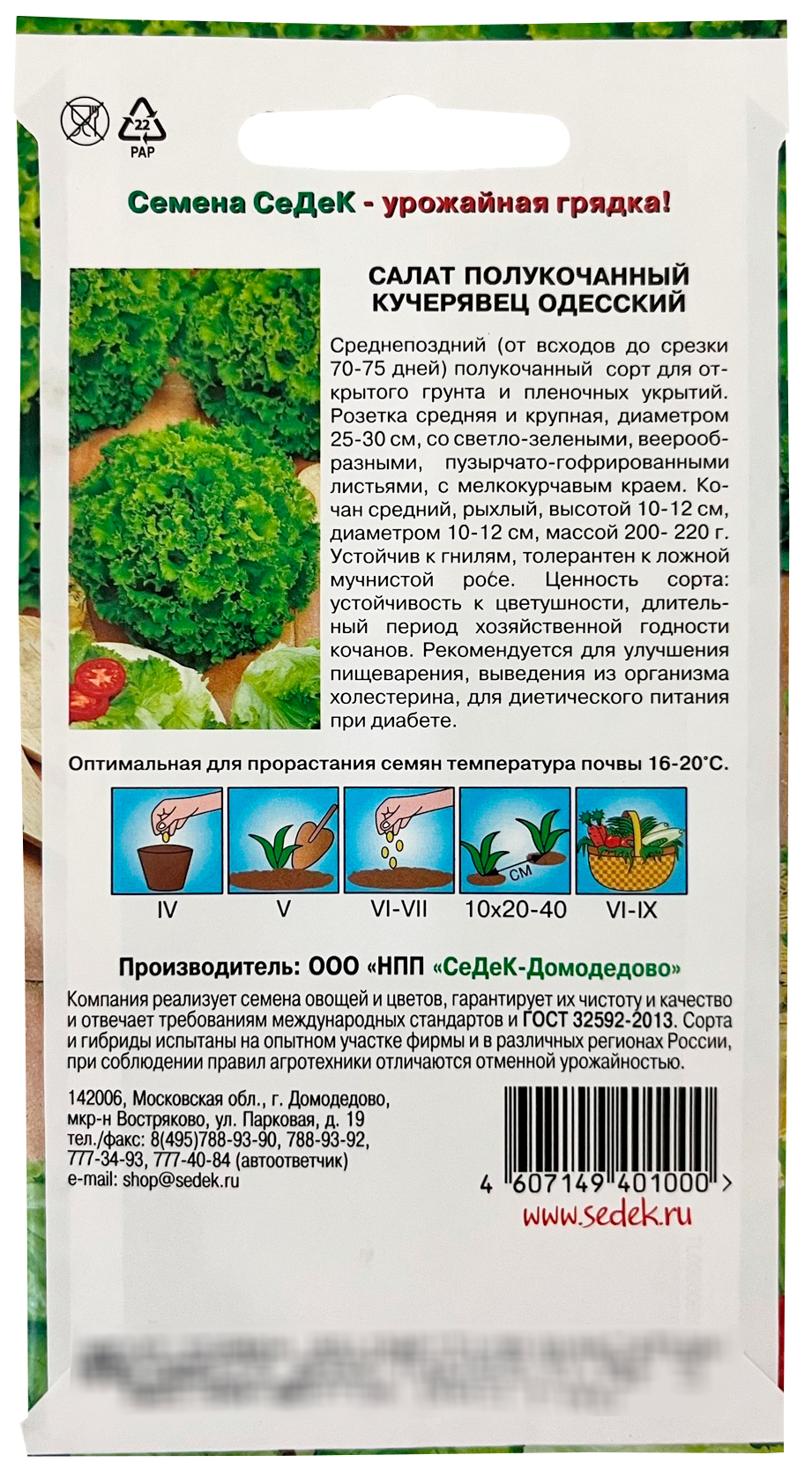 Салат Кучерявец Одесский (полукочанный)Среднепоздний (от всходов до срезки 70-75 дней) кочанный сорт, для открытого грунта и пленочных укрытий. Розетка средняя и крупная, диаметром 25-30 см, со светло-зелеными веерообразными пузырчато-гофрированными листьями, с мелкокурчавым краем. Кочан средний, рыхлый, высотой 10-12 см, диаметром 10-12 см, массой 200-220 г. Устойчив к гнилям, толерантен к ложной мучнистой росе. Ценность сорта: устойчивость к цветушности, длительный период хозяйственной годности кочанов. Рекомендуется для улучшения пищеварения, выведения из организма холестерина, для диетического питания при диабете.