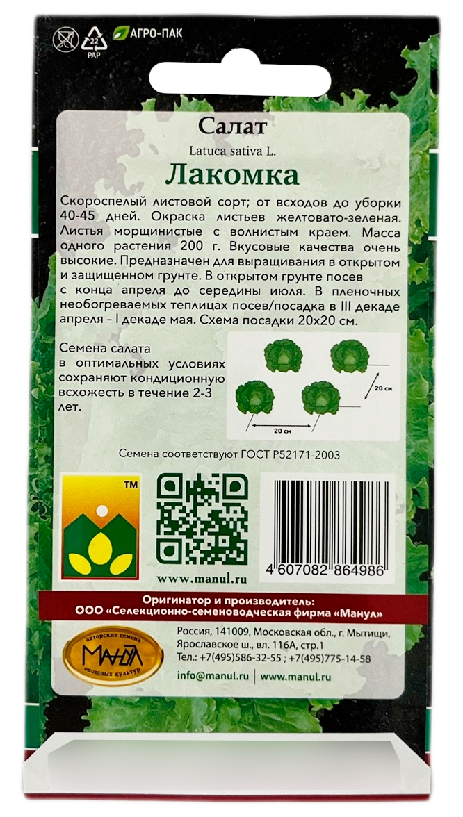 Салат Лакомка МАНУЛСкороспелый листовой сорт. От всходов до уборки 40-45 дней. Окраска листьев желтовато-зеленая. Листья слабо морщинистые, с волнистым краем. Масса одного растения до 200 г. Предназначен для выращивания в открытом и защищенном грунте. В открытом грунте посев с конца апреля до середины июля. В пленочных необогреваемых теплицах посев/посадка в III декаде апреля — I декаде мая. Схема посадки 20×20 см.