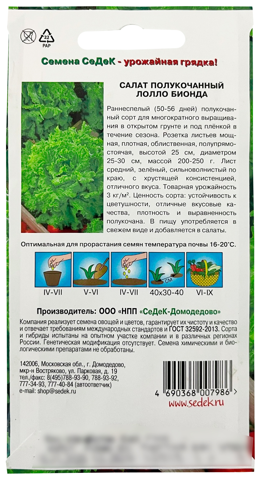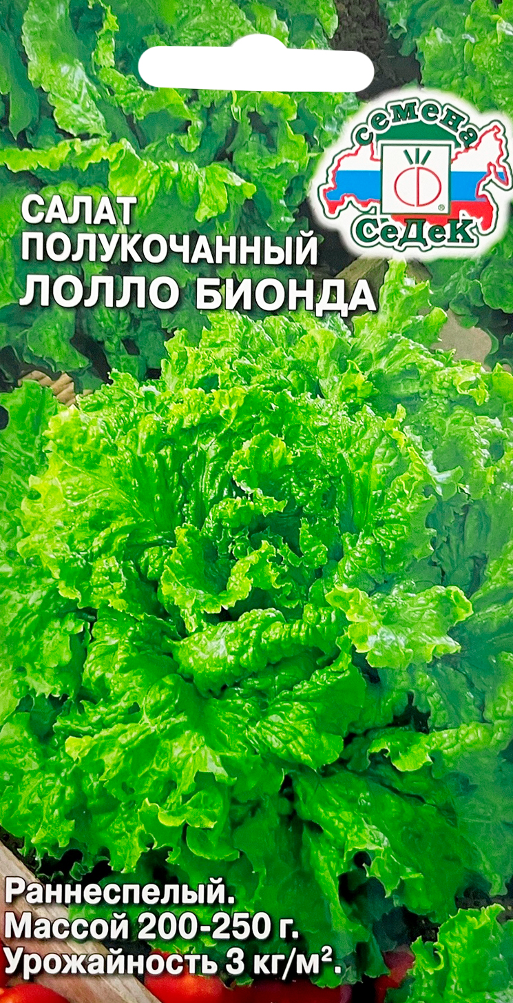 Салат Лолло БиондаРаннеспелый (50-56 дней) полукочанный сорт для многократного выращивания в открытом грунте и под плёнкой в течение сезона. Розетка листьев мощная, плотная, облиственная, полупрямостоячая, высотой 25 см, диаметром 25-30 см, массой 200-250 г. Лист средний, зелёный, сильноволнистый по краю, с хрустящей консистенцией, отличного вкуса. Товарная урожайность 3 кг/м2. Ценность сорта: устойчивость к цветушности, отличные вкусовые качества, плотность и выравненность полукочана. В пищу употребляется в свежем виде и добавления в салаты.