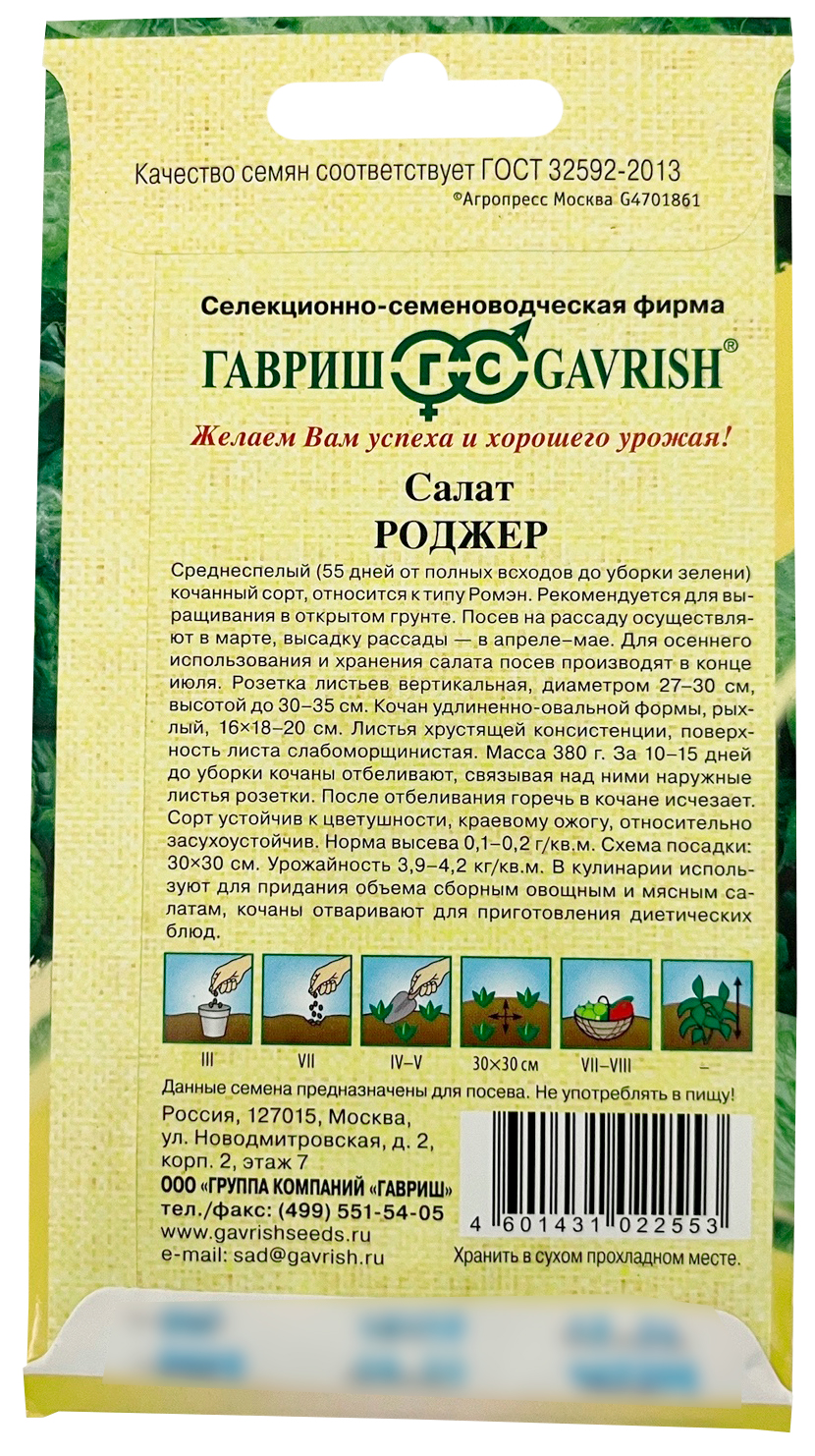 Салат РоджерСреднеспелый (55 дней от полных всходов до уборки зелени) полукочанный сорт, относится к типу Ромен. Рекомендуется для выращивания в открытом грунте. Посев на рассаду осуществляют в марте, высадку рассады – в апреле - мае. Для осеннего использования и хранения салата посев производят в конце июля. Розетка листьев вертикальная, диаметром 27-30 см, высотой до 30-35 см. Кочан удлиненно-овальной формы, рыхлый, 16х20 см. Листья хрустящей консистенции, поверхность листа слабоморщинистая. Масса 380 г. За 10-15 дней до уборки кочаны отбеливают, связывая над ними наружные листья розетки. После отбеливания горечь в кочане исчезает. Сорт устойчив к цветушности, краевому ожогу, относительно засухоустойчив. Норма высева 0,1-0,2 г/м2. Схема посадки 30 x 30 см. Урожайность 3,9-4,2 кг/ м2. В кулинарии используют для придания объема сборным овощным и мясным салатам, кочаны отваривают для приготовления диетических блюд.