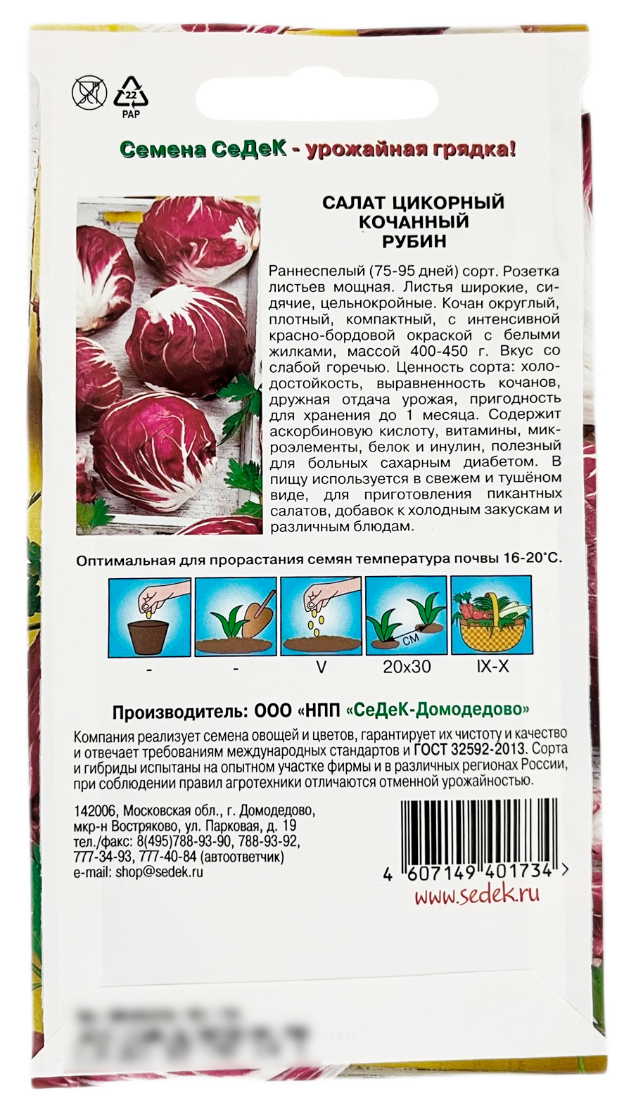 Салат цикорный КОЧАННЫЙ РУБИН СеДеКРаннеспелый (75-95 дней) сорт. Розетка листьев мощная. Листья широкие, сидячие, цельнокройные. Кочан округлый, плотный, компактный, с интенсивной красно-бордовой окраской с белыми жилками, массой 400-450 г. Вкус со слабой горечью. Ценность сорта: холодостойкость, выравненность кочанов, дружная отдача урожая, пригодность для хранения до 1 месяца. Содержит аскорбиновую кислоту, витамины, микроэлементы, белок и инулин, полезный для больных сахарным диабетом. В пищу используется в свежем и тушёном виде, для приготовления пикантных салатов, добавок к холодным закускам и различным блюдам.