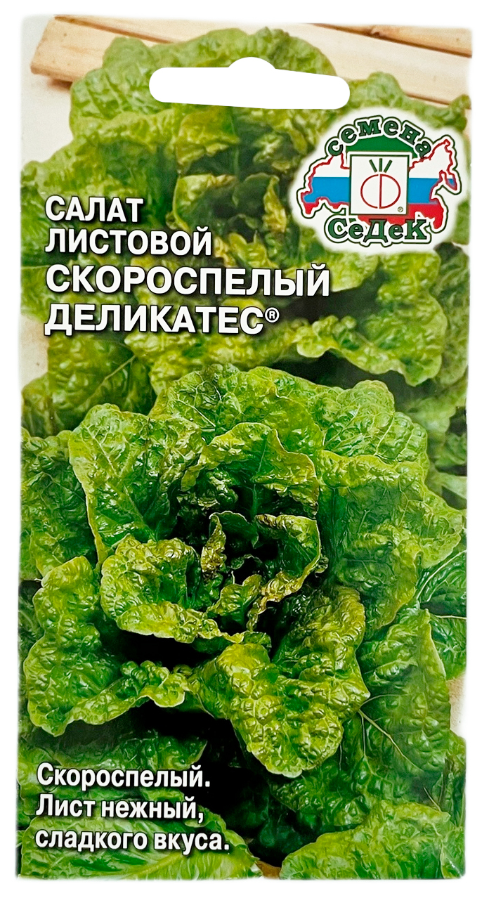 Салат листовой скороспелый деликатес СеДеКСкороспелый (от всходов до технической спелости 39-42 дня) сорт для открытого грунта и пленочных укрытий. Розетка листьев крупная, диаметром 22-27 см. Лист бледно-зелёный, цельнокрайний со среднепузырчатой поверхностью, нежного сочного вкуса. Масса одного растения 100-120 г. Ценность сорта: раннеспелость, пригодность для одноразового сбора. Отличный диетический продукт при диабете, так как содержит витамин PP, активирующий действие инсулина. Рекомендуется для употребления в свежем виде.
