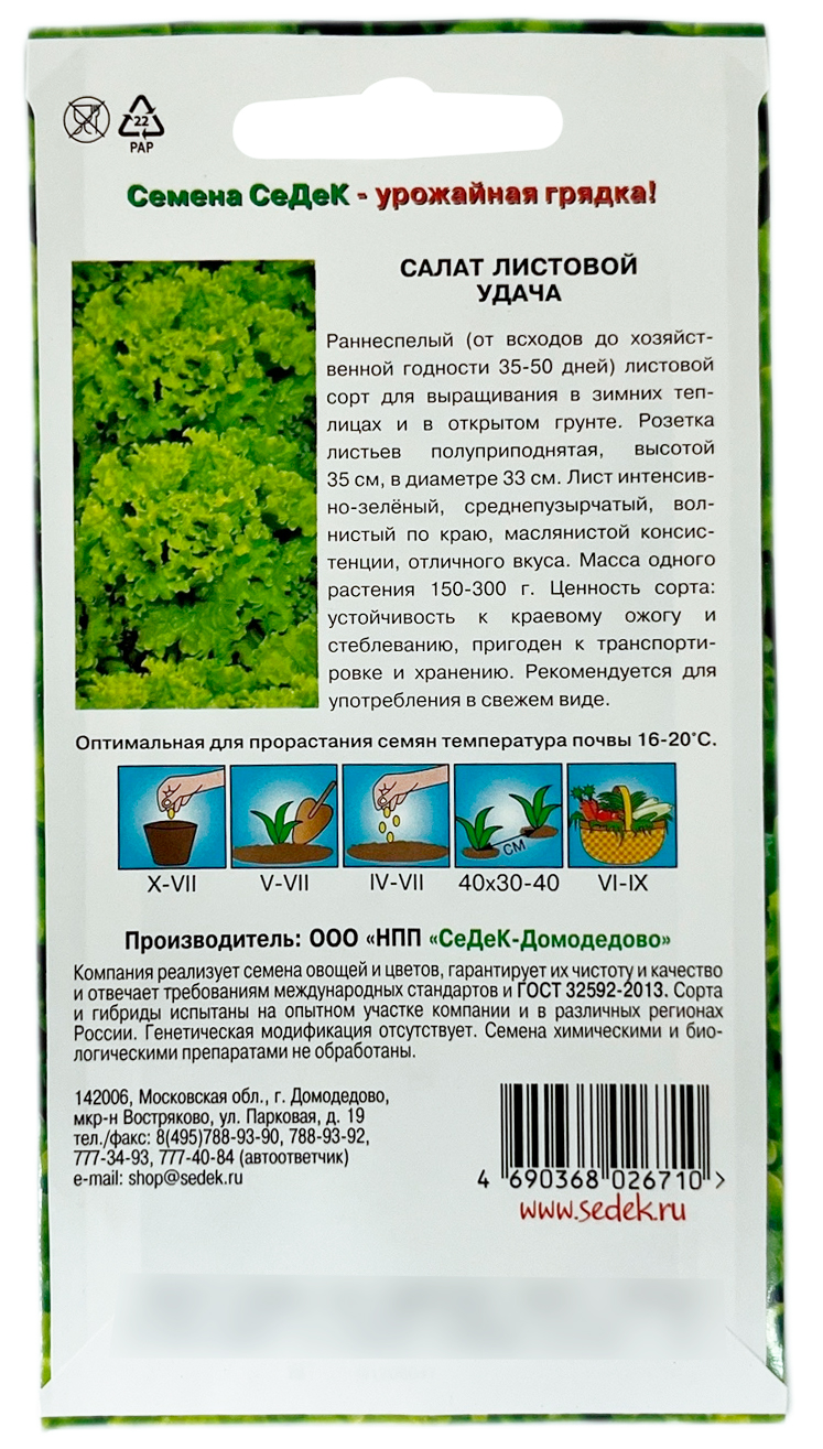 Салат листовой УДАЧА СеДеКРаннеспелый (от всходов до хозяйственной годности 35-50 день) листовой сорт для выращивания в зимних теплицах и в открытом грунте. Розетка листьев полуприподнятая высотой 35 см, в диаметре 33 см. Лист интенсивно-зелёный, среднепузырчатый, волнистый по краю, маслянистой консистенции, отличного вкуса. Масса одного растения 150-300 г. Ценность сорта: устойчивость к краевому ожогу, к стеблеванию, пригоден к транспортировке и хранению. Рекомендуется для употребления в свежем виде.