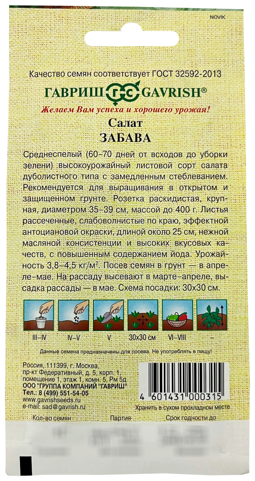Салат ЗабаваСреднеспелый (60-70 дней от всходов до уборки урожая) высокоурожайный листовой сорт салата дуболистного типа с замедленным стеблеванием, отличных вкусовых качеств. Розетка раскидистая, крупная, массой до 400 г, диаметр 39-35 см. Листья рассеченные, слабоволнистые по краю, эффектной антоциановой окраски, длиной около 25 см, нежной консистенции и высоких вкусовых качеств. Посев – в начале апреля непосредственно в грунт (0,2 г/м2) или в марте на рассаду (выход сеянцев из 1 г семян около 800 шт., схема посадки 30х30-35 см). При таком способе выращивания через 60-70 дней после всходов образуется крупная (до 40 см в диаметре) полураскидистая розетка листьев массой до 200 г.