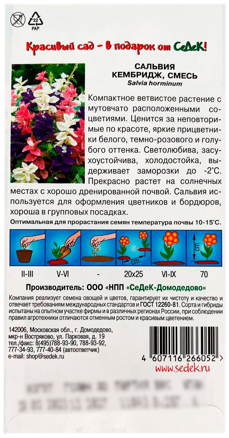 Сальвия КЕМБРИДЖ (СМЕСЬ) СеДеККомпактное ветвистое растение с мутовчато расположенными соцветиями. Ценится за неповторимые по красоте, яркие прицветники белого, темно-розового и голубого оттенков. Светолюбива, засухоустойчива, холодостойка, выдерживает заморозки до -2°С. Прекрасно растет на солнечных местах с хорошо дренированной почвой. Используют для оформления цветников и бордюров, хороша в групповых посадках.